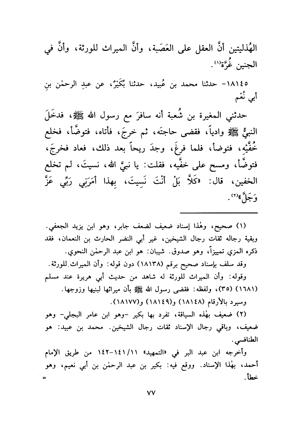 الْهُذَلِيَّتَيْنِ أَنَّ الْعَقْلَ عَلَى الْعَصَبَةِ، وَأَنَّ الْمِيرَاثَ لِلْوَرَثَةِ، وَأَنَّ فِي الْجَنِينِ غُرَّةً " (١)