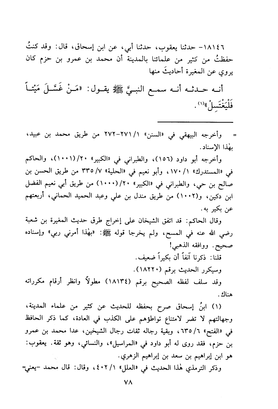 ١٨١٤٦ - حَدَّثَنَا يَعْقُوبُ، حَدَّثَنَا أَبِي، عَنِ ابْنِ إِسْحَاقَ، قَالَ: وَقَدْ كُنْتُ حَفِظْتُ مِنْ كَثِيرٍ مِنْ عُلَمَائِنَا بِالْمَدِينَةِ أَنَّ مُحَمَّدَ بْنَ عَمْرِو بْنِ حَزْمٍ كَانَ يَرْوِي عَنِ الْمُغِيرَةِ أَحَادِيثَ مِنْهَا، أَنَّهُ حَدَّثَهُ أَنَّهُ سَمِعَ النَّبِيَّ صَلَّى اللهُ عَلَيْهِ وَسَلَّمَ يَقُولُ: " مَنْ غَسَّلَ مَيِّتًا، فَلْيَغْتَسِلْ " (١)