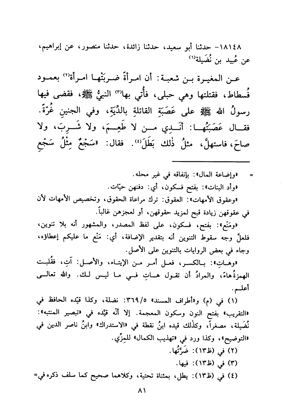 ١٨١٤٨ - حَدَّثَنَا أَبُو سَعِيدٍ، حَدَّثَنَا زَائِدَةُ، حَدَّثَنَا مَنْصُورٌ، عَنْ إِبْرَاهِيمَ، عَنْ عُبَيْدِ بْنِ نُضَيْلَةَ، (١) عَنْ الْمُغِيرَةِ بْنِ شُعْبَةَ: أَنَّ امْرَأَةً ضَرَبَتْهَا امْرَأَةٌ (٢) بِعَمُودِ فُسْطَاطٍ، فَقَتَلَتْهَا وَهِيَ حُبْلَى، فَأُتِيَ بِهَا (٣) النَّبِيُّ صَلَّى اللهُ عَلَيْهِ وَسَلَّمَ، فَقَضَى فِيهَا رَسُولُ اللهِ صَلَّى اللهُ عَلَيْهِ وَسَلَّمَ، عَلَى عَصَبَةِ الْقَاتِلَةِ بِالدِّيَةِ، وَفِي الْجَنِينِ غُرَّةٌ، فَقَالَ عَصَبَتُهَا: أَنْدِي مَنْ لَا طَعِمَ، وَلَا شَرِبَ، وَلَا صَاحَ، فَاسْتَهَلَّ مِثْلُ ذَلِكَ بَطَلَ، (٤) فَقَالَ: " سَجْعٌ مِثْلُ سَجْعِ