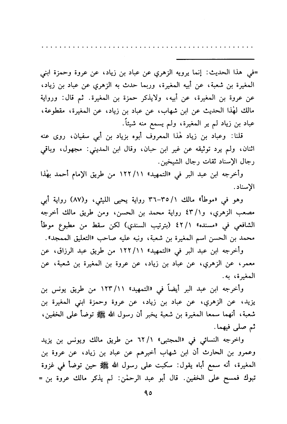 = في هذا الحديث: إنما يرويه الزهري عن عباد بن زياد، عن عروة وحمزة ابني المغيرة بن شعبة، عن أبيه المغيرة، وربما حدث به الزهري عن عباد بن زياد، عن عروة بن المغيرة، عن أبيه، ولا يذكر حمزة بن المغيرة. ثم قال: ورواية مالك لهذا الحديث عن ابن شهاب، عن عباد بن زياد، عن المغيرة، مقطوعة، عباد بن زياد لم ير المغيرة، ولم يسمع منه شيئاً.