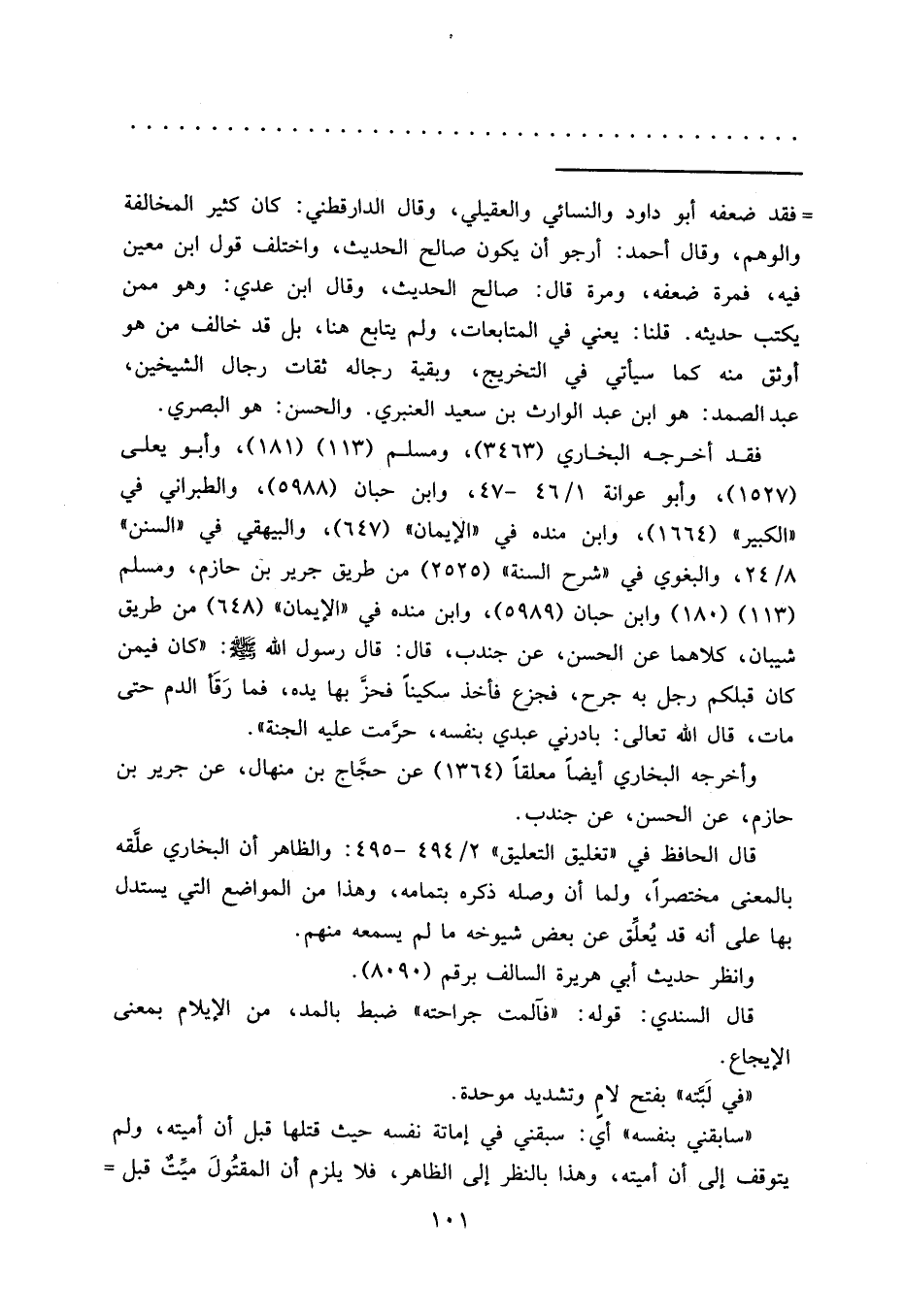 (١١٣) (١٨٠) وابن حبان (٥٩٨٩) ، وابن منده في "الإيمان" (٦٤٨) من طريق شيبان، كلاهما عن الحسن، عن جندب، قال: قال رسول الله صَلَّى اللهُ عَلَيْهِ وَسَلَّمَ: "كان فيمن كان قبلكم رجل به جرح، فجزع فأخذ سكيناً فحز بها يده، فما رَقَأ الدم حتى مات، قال الله تعالى: بادرني عبدي بنفسه، حرَّمت عليه الجنة".