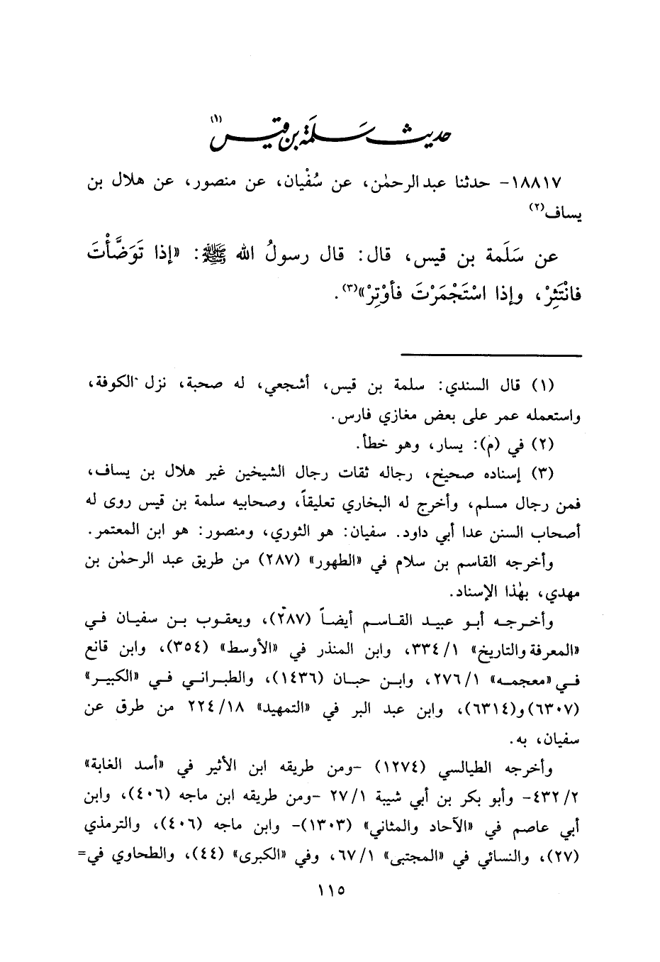 ١٨٨١٧ - حَدَّثَنَا عَبْدُ الرَّحْمَنِ، عَنْ سُفْيَانَ، عَنْ مَنْصُورٍ، عَنْ هِلَالِ بْنِ يِسَافٍ (٢) ، عَنْ سَلَمَةَ بْنِ قَيْسٍ قَالَ: قَالَ رَسُولُ اللهِ صَلَّى اللهُ عَلَيْهِ وَسَلَّمَ: " إِذَا تَوَضَّأْتَ فَانْتَثِرْ، وَإِذَا اسْتَجْمَرْتَ فَأَوْتِرْ " (٣)