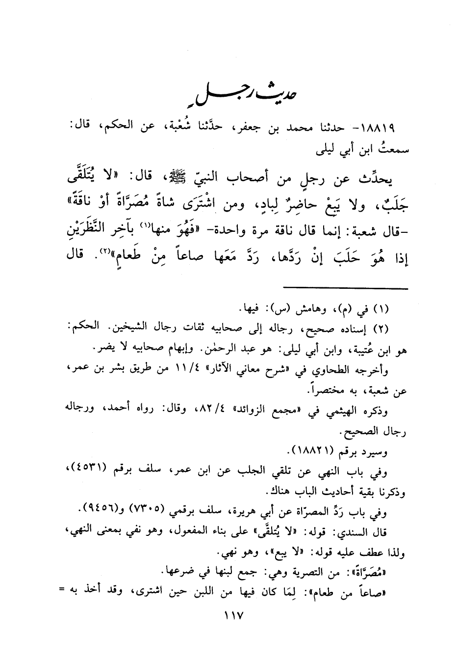 ١٨٨١٩ - حَدَّثَنَا مُحَمَّدُ بْنُ جَعْفَرٍ، حَدَّثَنَا شُعْبَةُ، عَنِ الْحَكَمِ، قَالَ: سَمِعْتُ ابْنَ أَبِي لَيْلَى، يُحَدِّثُ، عَنْ رَجُلٍ، مِنْ أَصْحَابِ النَّبِيِّ صَلَّى اللهُ عَلَيْهِ وَسَلَّمَ قَالَ: " لَا يُتَلَقَّى جَلَبٌ، وَلَا يَبِعْ حَاضِرٌ لِبَادٍ، وَمَنْ اشْتَرَى شَاةً مُصَرَّاةً أَوْ نَاقَةً، قَالَ شُعْبَةُ: إِنَّمَا قَالَ نَاقَةً مَرَّةً وَاحِدَةً، فَهُوَ مِنْهَا (١) بِآخِرِ النَّظَرَيْنِ، إِذَا هُوَ حَلَبَ إِنْ رَدَّهَا، رَدَّ مَعَهَا صَاعًا مِنْ طَعَامٍ (٢) "، قَالَ