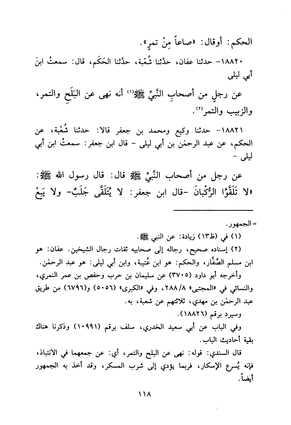 ١٨٨٢١ - حَدَّثَنَا وَكِيعٌ، وَمُحَمَّدُ بْنُ جَعْفَرٍ، قَالَا: حَدَّثَنَا شُعْبَةُ، عَنِ الْحَكَمِ، عَنْ عَبْدِ الرَّحْمَنِ بْنِ أَبِي لَيْلَى، قَالَ ابْنُ جَعْفَرٍ: سَمِعْتُ ابْنَ أَبِي لَيْلَى، عَنْ رَجُلٍ، مِنْ أَصْحَابِ النَّبِيِّ صَلَّى اللهُ عَلَيْهِ وَسَلَّمَ قَالَ: قَالَ رَسُولُ اللهِ صَلَّى اللهُ عَلَيْهِ وَسَلَّمَ: " لَا تَلَقَّوْا الرُّكْبَانَ، قَالَ ابْنُ جَعْفَرٍ: لَا يُتَلَقَّى جَلَبٌ، وَلَا يَبِعْ