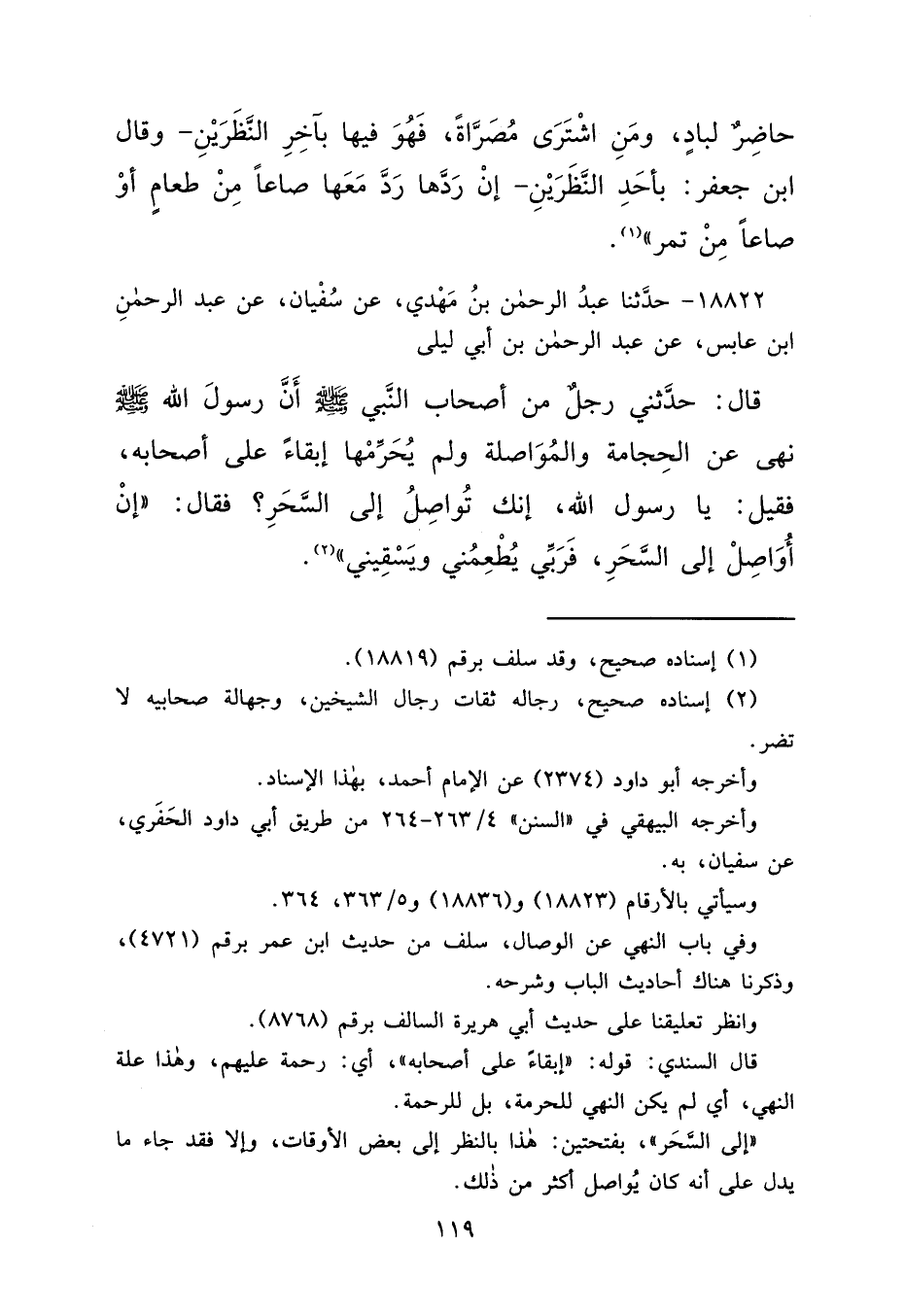 ١٨٨٢٢ - حَدَّثَنَا عَبْدُ الرَّحْمَنِ بْنُ مَهْدِيٍّ، عَنْ سُفْيَانَ، عَنْ عَبْدِ الرَّحْمَنِ بْنِ عَابِسٍ، عَنْ عَبْدِ الرَّحْمَنِ بْنِ أَبِي لَيْلَى، قَالَ: حَدَّثَنِي رَجُلٌ، مِنْ أَصْحَابِ النَّبِيِّ صَلَّى اللهُ عَلَيْهِ وَسَلَّمَ، أَنَّ رَسُولَ اللهِ صَلَّى اللهُ عَلَيْهِ وَسَلَّمَ نَهَى عَنِ الْحِجَامَةِ، وَالْمُوَاصَلَةِ، وَلَمْ يُحَرِّمْهَا إِبْقَاءً عَلَى أَصْحَابِهِ، فَقِيلَ: يَا رَسُولَ اللهِ، إِنَّكَ تُوَاصِلُ إِلَى السَّحَرِ، فَقَالَ: " إِنْ أُوَاصِلُ إِلَى السَّحَرِ، فَرَبِّي يُطْعِمُنِي وَيَسْقِينِي " (٢)