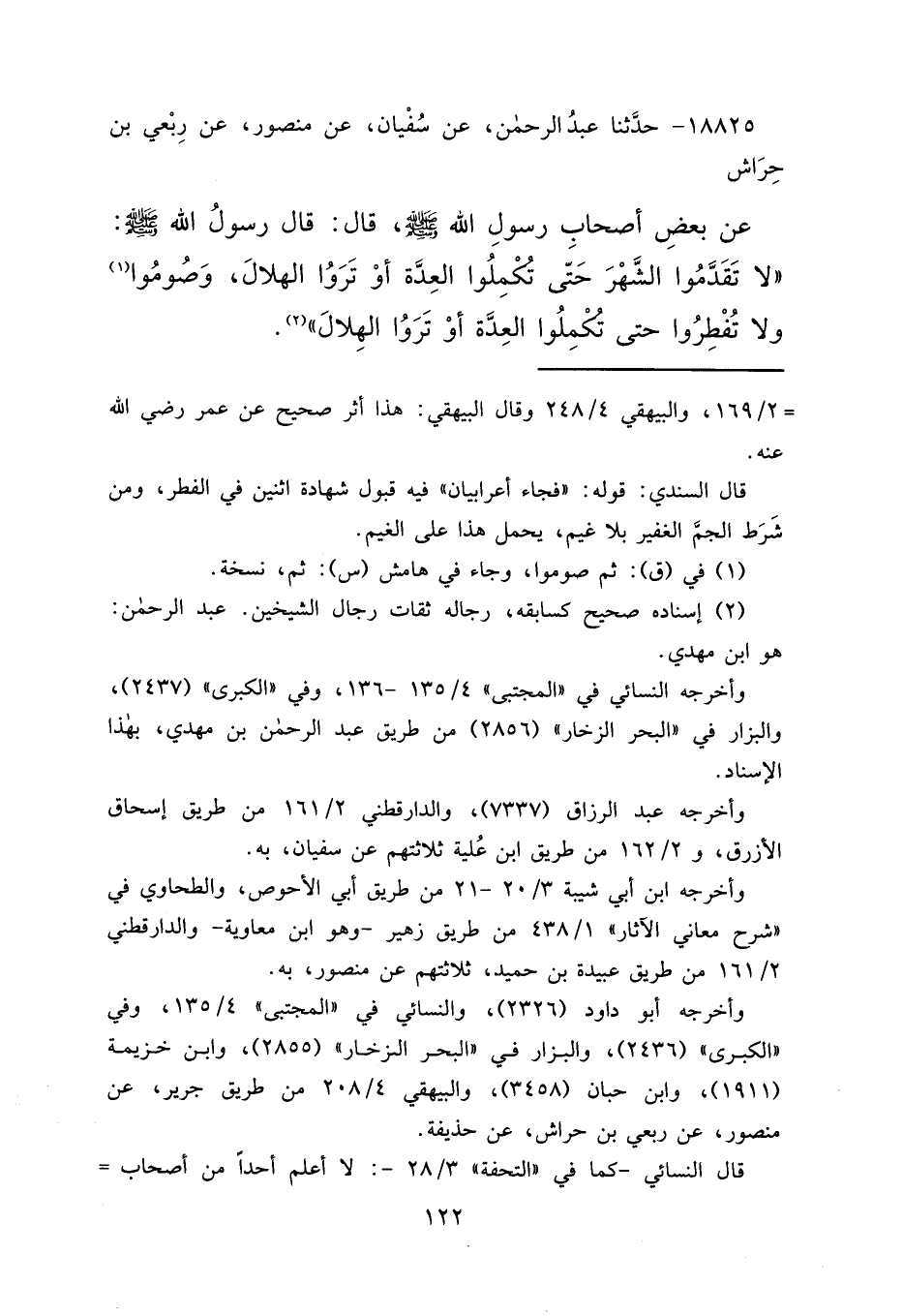 ١٨٨٢٥ - حَدَّثَنَا عَبْدُ الرَّحْمَنِ، عَنْ سُفْيَانَ، عَنْ مَنْصُورٍ، عَنْ رِبْعِيِّ بْنِ حِرَاشٍ، عَنْ بَعْضِ أَصْحَابِ رَسُولِ اللهِ صَلَّى اللهُ عَلَيْهِ وَسَلَّمَ قَالَ: قَالَ رَسُولُ اللهِ صَلَّى اللهُ عَلَيْهِ وَسَلَّمَ: " لَا تَقَدَّمُوا الشَّهْرَ حَتَّى تُكْمِلُوا الْعِدَّةَ، أَوْ تَرَوْا الْهِلَالَ، وَصُومُوا (١) وَلَا تُفْطِرُوا حَتَّى تُكْمِلُوا الْعِدَّةَ، أَوْ تَرَوْا الْهِلَالَ " (٢)