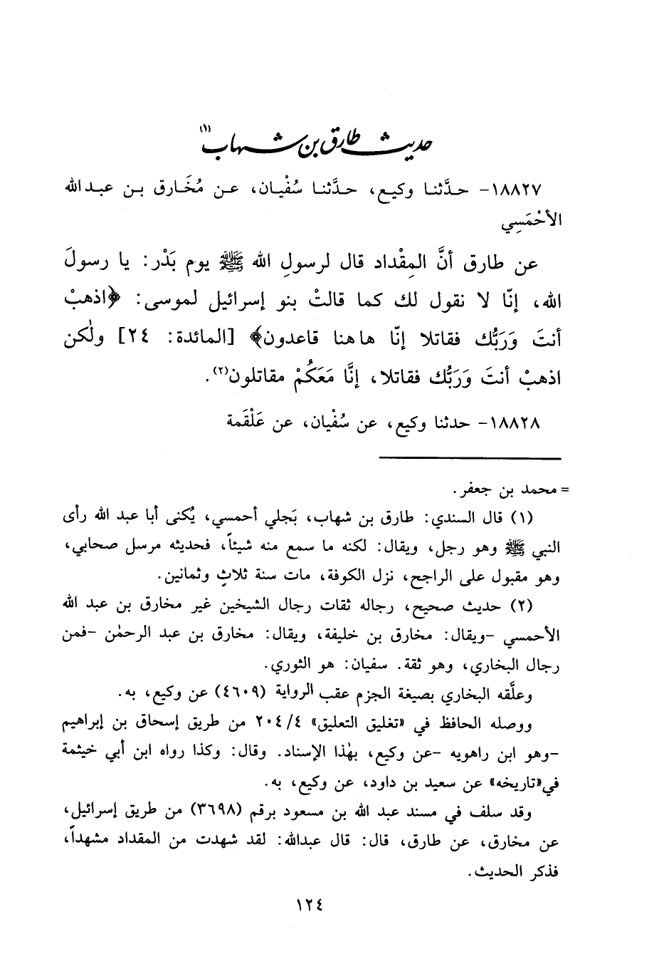 ١٨٨٢٧ - حَدَّثَنَا وَكِيعٌ، حَدَّثَنَا سُفْيَانُ، عَنْ مُخَارِقِ بْنِ عَبْدِ اللهِ الْأَحْمَسِيِّ، عَنْ طَارِقٍ، أَنَّ الْمِقْدَادَ قَالَ لِرَسُولِ اللهِ صَلَّى اللهُ عَلَيْهِ وَسَلَّمَ يَوْمَ بَدْرٍ: " يَا رَسُولَ اللهِ، إِنَّا لَا نَقُولُ لَكَ كَمَا قَالَتْ بَنُو إِسْرَائِيلَ لِمُوسَى: {اذْهَبْ أَنْتَ وَرَبُّكَ فَقَاتِلَا إِنَّا هَاهُنَا قَاعِدُونَ} ، وَلَكِنْ اذْهَبْ أَنْتَ وَرَبُّكَ فَقَاتِلَا، إِنَّا مَعَكُمْ مُقَاتِلُونَ " (٢)