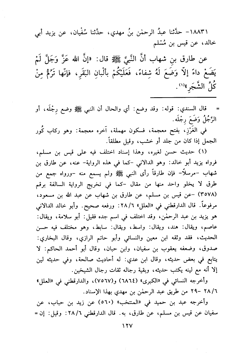 ١٨٨٣١ - حَدَّثَنَا عَبْدُ الرَّحْمَنِ بْنُ مَهْدِيٍّ، حَدَّثَنَا سُفْيَانُ، عَنْ يَزِيدَ أَبِي خَالِدٍ، عَنْ قَيْسِ بْنِ مُسْلِمٍ، عَنْ طَارِقِ بْنِ شِهَابٍ، أَنَّ النَّبِيَّ صَلَّى اللهُ عَلَيْهِ وَسَلَّمَ قَالَ: " إِنَّ اللهَ عَزَّ وَجَلَّ لَمْ يَضَعْ دَاءً إِلَّا وَضَعَ لَهُ شِفَاءً، فَعَلَيْكُمْ بِأَلْبَانِ الْبَقَرِ، فَإِنَّهَا تَرُمُّ مِنْ كُلِّ الشَّجَرِ " (١)