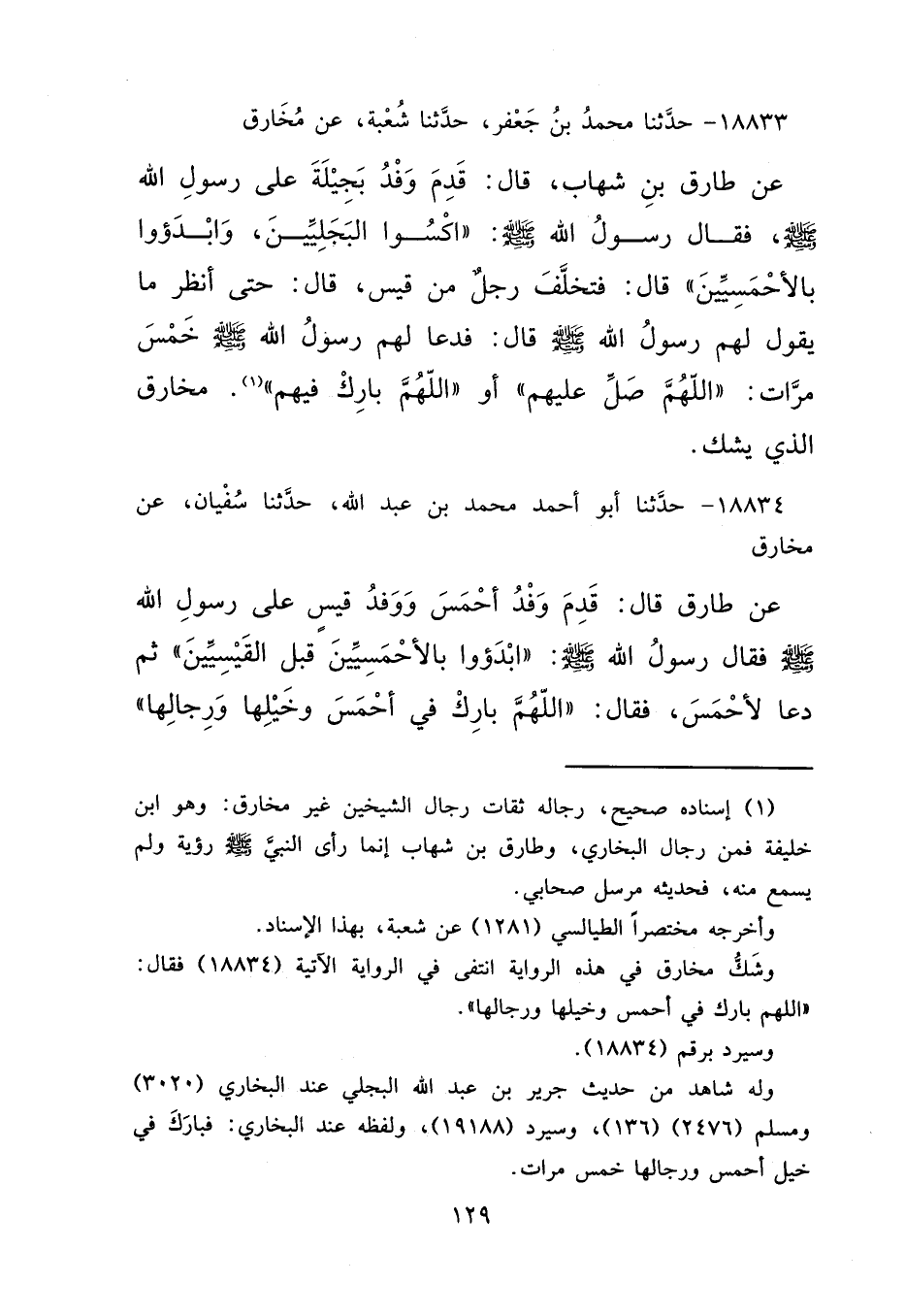 ١٨٨٣٣ - حَدَّثَنَا مُحَمَّدُ بْنُ جَعْفَرٍ، حَدَّثَنَا شُعْبَةُ، عَنْ مُخَارِقٍ، عَنْ طَارِقِ بْنِ شِهَابٍ قَالَ: قَدِمَ وَفْدُ بَجِيلَةَ عَلَى رَسُولِ اللهِ صَلَّى اللهُ عَلَيْهِ وَسَلَّمَ، فَقَالَ رَسُولُ اللهِ صَلَّى اللهُ عَلَيْهِ وَسَلَّمَ: " اكْسُوا الْبَجَلِيِّينَ، وَابْدَءُوا بِالْأَحْمَسِيِّينَ " قَالَ: فَتَخَلَّفَ رَجُلٌ مِنْ قَيْسٍ قَالَ: حَتَّى أَنْظُرَ مَا يَقُولُ لَهُمْ رَسُولُ اللهِ صَلَّى اللهُ عَلَيْهِ وَسَلَّمَ: قَالَ: فَدَعَا لَهُمْ رَسُولُ اللهِ صَلَّى اللهُ عَلَيْهِ وَسَلَّمَ خَمْسَ مَرَّاتٍ: " اللهُمَّ صَلِّ عَلَيْهِمْ، أَوِ اللهُمَّ بَارِكْ فِيهِمْ (١) " مُخَارِقٌ الَّذِي يَشُكُّ
