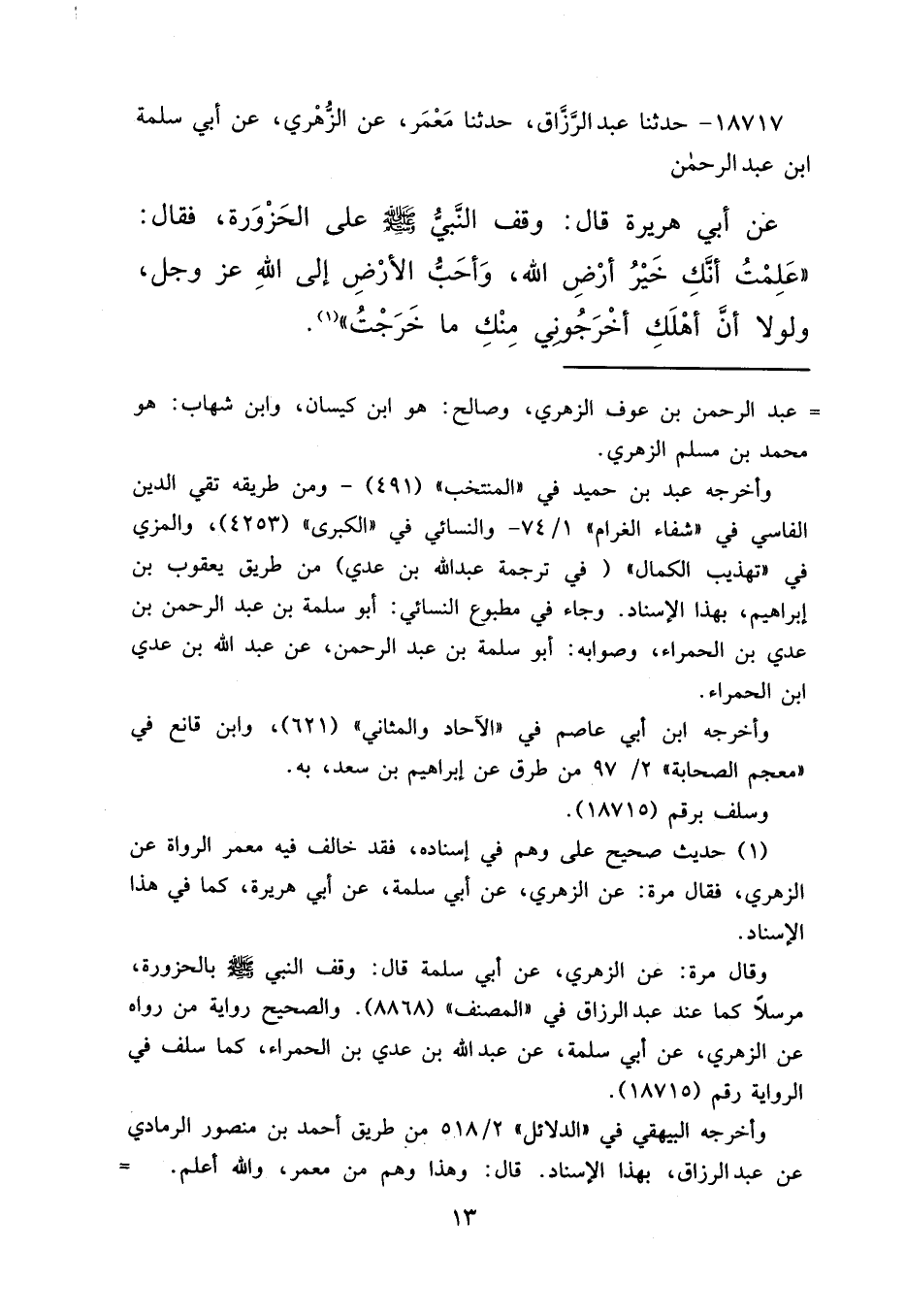 وقال مرة: عن الزهري، عن أبي سلمة قال: وقف النبي صَلَّى اللهُ عَلَيْهِ وَسَلَّمَ بالحزورة، مرسلاً كما عند عبد الرزاق في "المصنف" (٨٨٦٨) . والصحيح رواية من رواه عن الزهري، عن أبي سلمة، عن عبد الله بن عدي بن الحمراء، كما سلف في الرواية رقم (١٨٧١٥) .