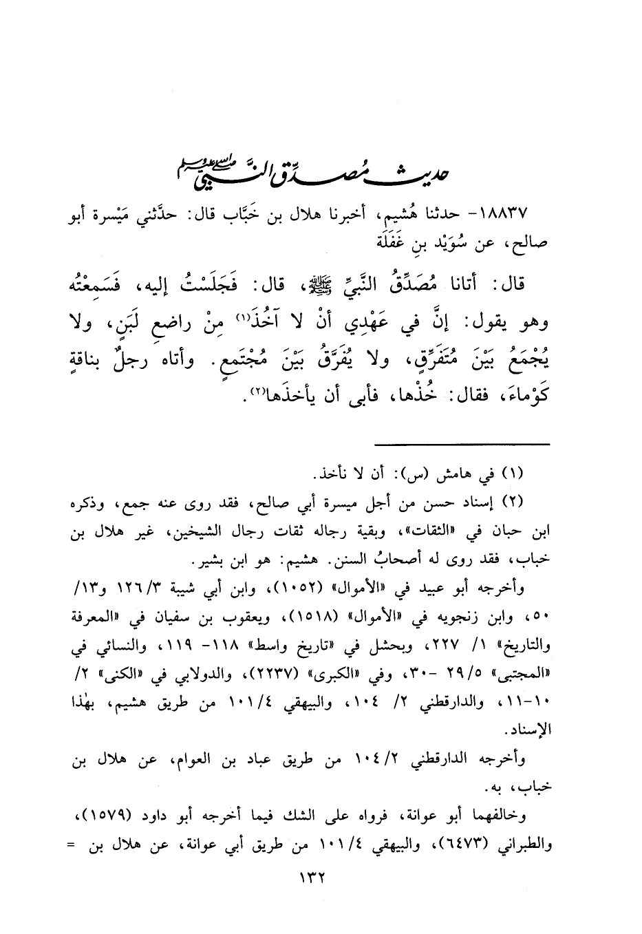 ١٨٨٣٧ - حَدَّثَنَا هُشَيْمٌ، أَخْبَرَنَا هِلَالُ بْنُ خَبَّابٍ، قَالَ: حَدَّثَنِي مَيْسَرَةُ أَبُو صَالِحٍ، عَنْ سُوَيْدِ بْنِ غَفَلَةَ قَالَ: أَتَانَا مُصَدِّقُ النَّبِيِّ صَلَّى اللهُ عَلَيْهِ وَسَلَّمَ، قَالَ: فَجَلَسْتُ إِلَيْهِ فَسَمِعْتُهُ وَهُوَ يَقُولُ: " إِنَّ فِي عَهْدِي أَنْ لَا آخُذَ (١) مِنْ رَاضِعِ لَبَنٍ، وَلَا يُجْمَعُ بَيْنَ مُتَفَرِّقٍ، وَلَا يُفَرَّقُ بَيْنَ مُجْتَمِعٍ "، وَأَتَاهُ رَجُلٌ بِنَاقَةٍ كَوْمَاءَ فَقَالَ: خُذْهَا، فَأَبَى أَنْ يَأْخُذَهَا (٢)