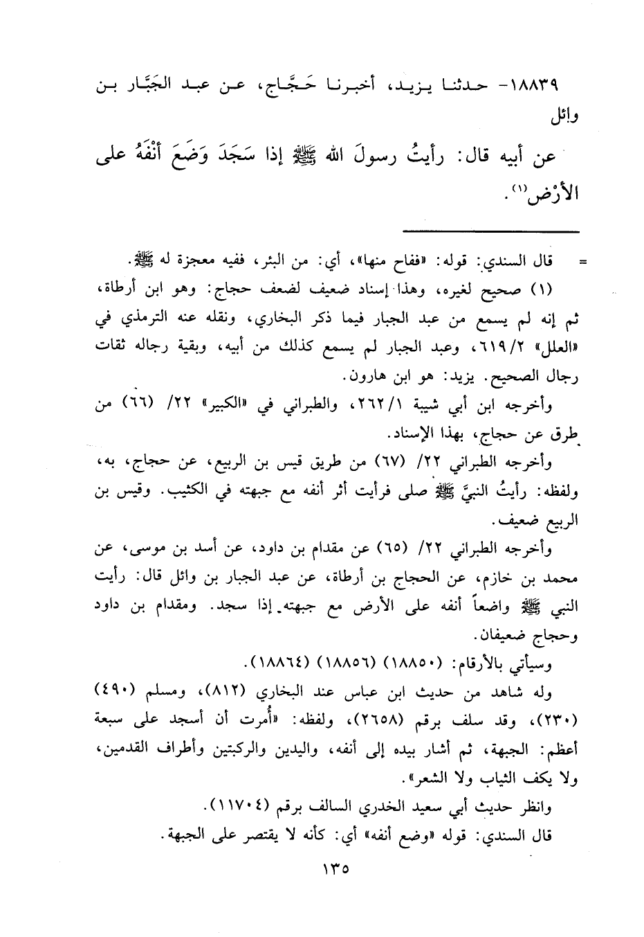 ١٨٨٣٩ - حَدَّثَنَا يَزِيدُ، أَخْبَرَنَا حَجَّاجٌ، عَنْ عَبْدِ الْجَبَّارِ بْنِ وَائِلٍ، عَنْ أَبِيهِ قَالَ: " رَأَيْتُ رَسُولَ اللهِ صَلَّى اللهُ عَلَيْهِ وَسَلَّمَ إِذَا سَجَدَ وَضَعَ أَنْفَهُ عَلَى الْأَرْضِ " (١)