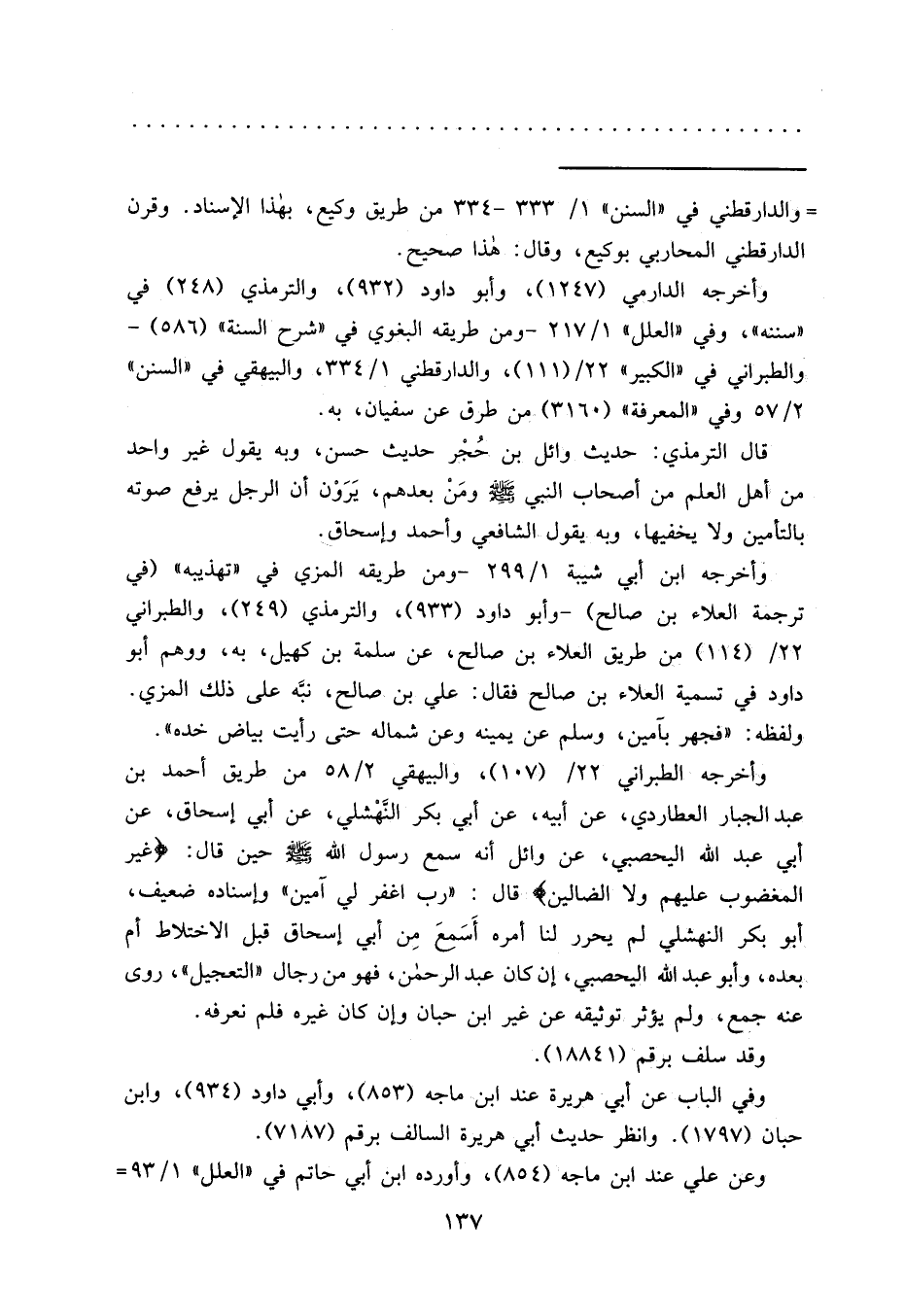 قال الترمذي: حديث وائل بن حُجْر حديث حسن، وبه يقول غير واحد من أهل العلم من أصحاب النبي صَلَّى اللهُ عَلَيْهِ وَسَلَّمَ ومَنْ بعدهم، يَرَوْن أن الرجل يرفع صوته بالتأمين ولا يخفيها، وبه يقول الشافعي وأحمد وإسحاق.