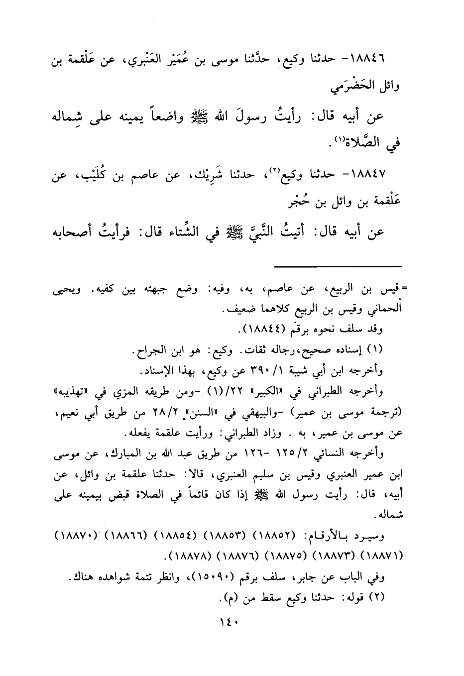 ١٨٨٤٦ - حَدَّثَنَا وَكِيعٌ، حَدَّثَنَا مُوسَى بْنُ عُمَيْرٍ الْعَنْبَرِيُّ، عَنْ عَلْقَمَةَ بْنِ وَائِلٍ الْحَضْرَمِيِّ، عَنْ أَبِيهِ قَالَ: " رَأَيْتُ رَسُولَ اللهِ صَلَّى اللهُ عَلَيْهِ وَسَلَّمَ وَاضِعًا يَمِينَهُ عَلَى شِمَالِهِ فِي الصَّلَاةِ " (١)