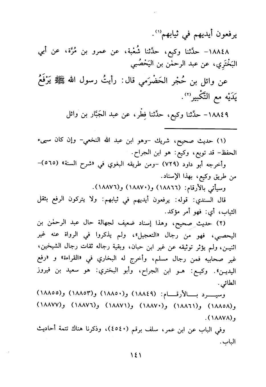 ١٨٨٤٨ - حَدَّثَنَا وَكِيعٌ، حَدَّثَنَا شُعْبَةُ، عَنْ عَمْرِو بْنِ مُرَّةَ، عَنْ أَبِي الْبَخْتَرِيِّ، عَنْ عَبْدِ الرَّحْمَنِ بْنِ الْيَحْصُبِيِّ، عَنْ وَائِلِ بْنِ حُجْرٍ الْحَضْرَمِيِّ قَالَ: " رَأَيْتُ رَسُولَ اللهِ صَلَّى اللهُ عَلَيْهِ وَسَلَّمَ يَرْفَعُ يَدَيْهِ مَعَ التَّكْبِيرِ " (٢)