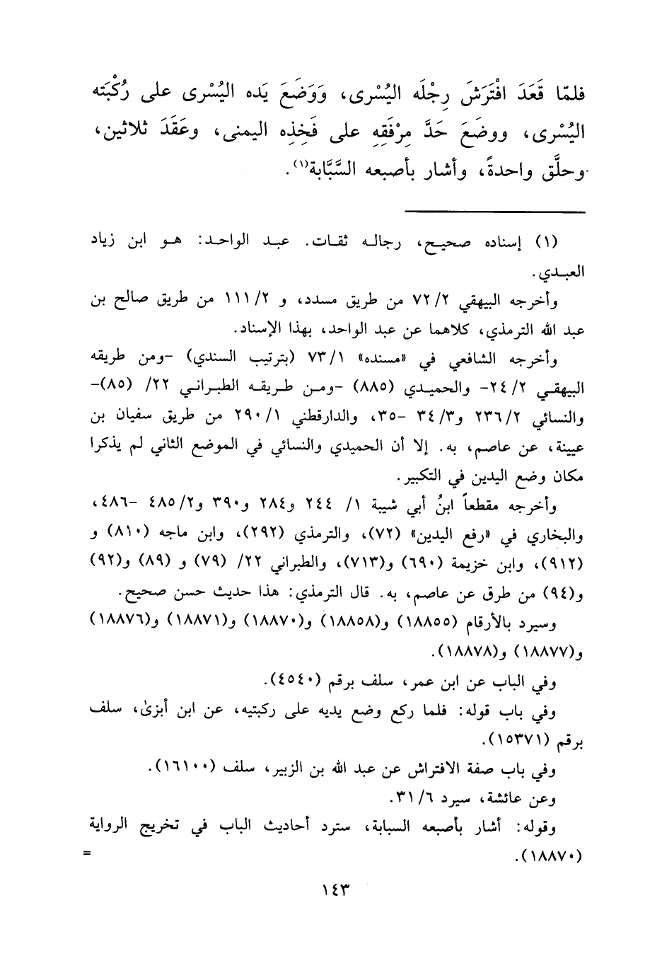 فَلَمَّا قَعَدَ افْتَرَشَ رِجْلَهُ الْيُسْرَى، وَوَضَعَ يَدَهُ الْيُسْرَى عَلَى رُكْبَتِهِ الْيُسْرَى، وَوَضَعَ حَدَّ مِرْفَقِهِ عَلَى فَخِذِهِ الْيُمْنَى، وَعَقَدَ ثَلَاثِينَ وَحَلَّقَ وَاحِدَةً، وَأَشَارَ بِإِصْبَعِهِ السَّبَّابَةِ " (١)