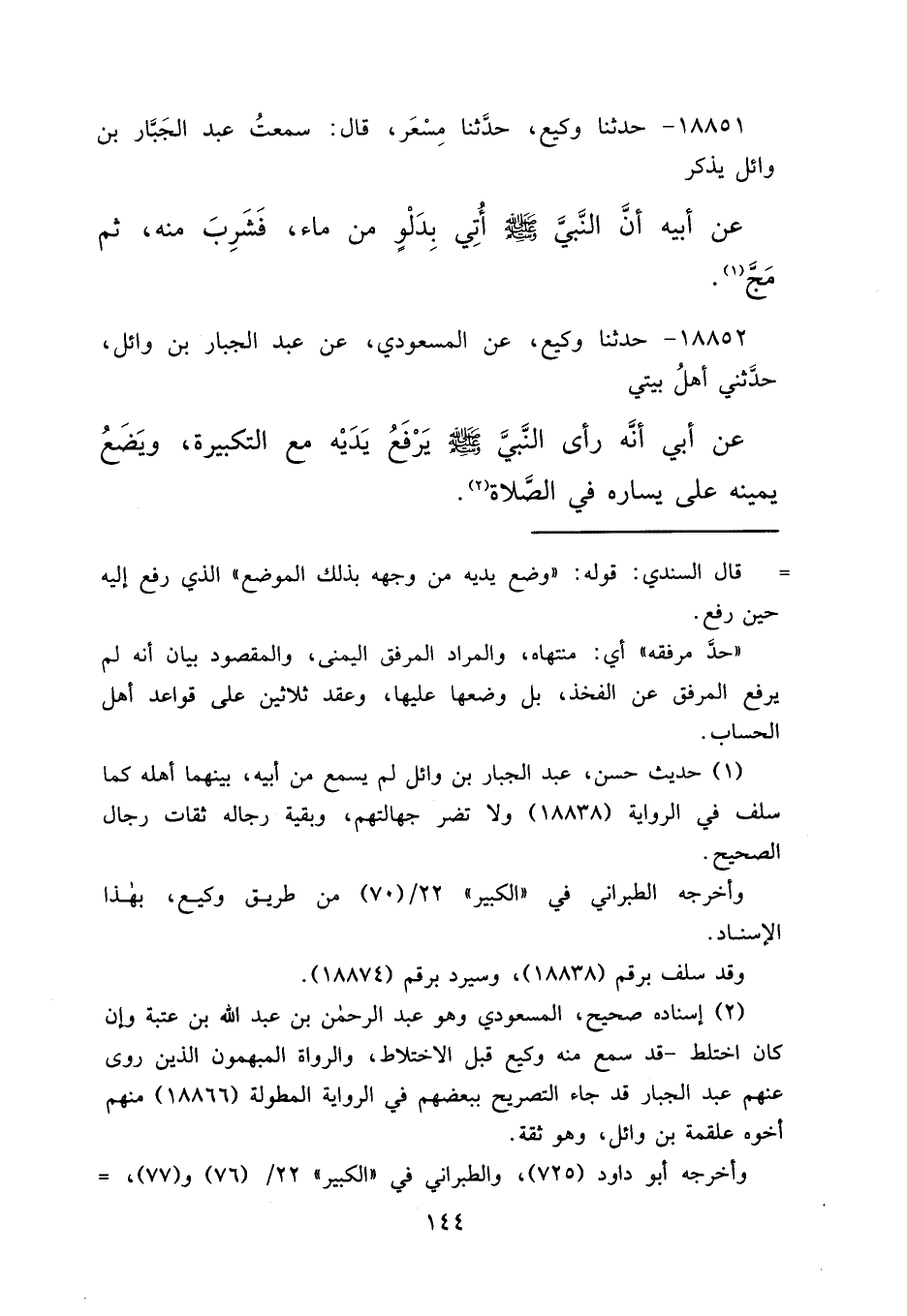 (٢) إسناده صحيح، المسعودي وهو عبد الرحمن بن عبد الله بن عتبة وإن كان اختلط- قد سمع منه وكيع قبل الاختلاط، والرواة المبهمون الذين روى عنهم عبد الجبار قد جاء التصريح ببعضهم في الرواية المطولة (١٨٨٦٦) منهم أخوه علقمة بن وائل، وهو ثقة.
