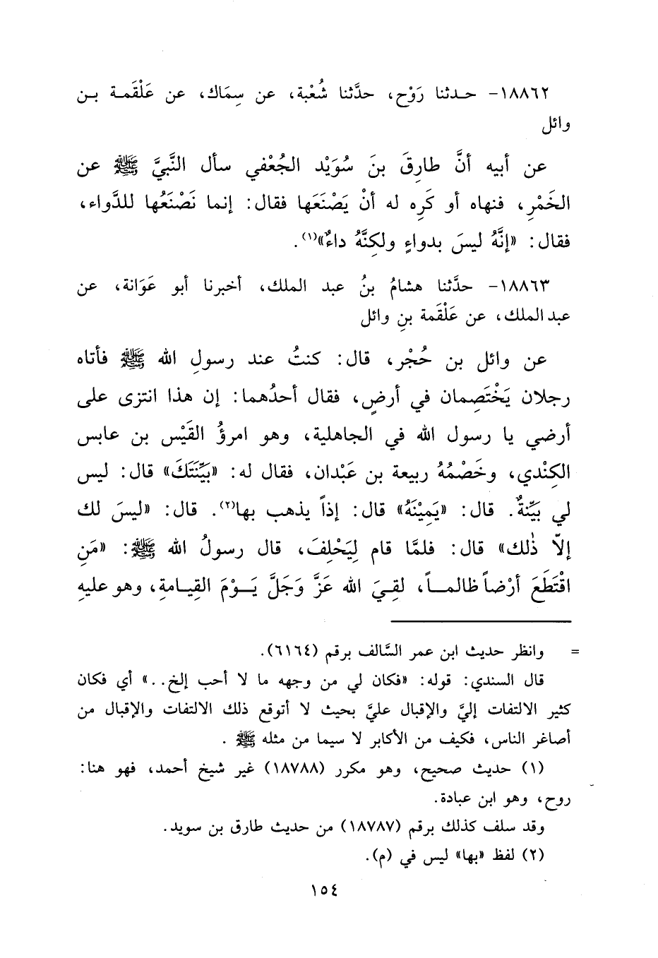 ١٨٨٦٣ - حَدَّثَنَا هِشَامُ بْنُ عَبْدِ الْمَلِكِ، أَخْبَرَنَا أَبُو عَوَانَةَ، عَنْ عَبْدِ الْمَلِكِ، عَنْ عَلْقَمَةَ بْنِ وَائِلٍ، عَنْ وَائِلِ بْنِ حُجْرٍ قَالَ: كُنْتُ عِنْدَ رَسُولِ اللهِ صَلَّى اللهُ عَلَيْهِ وَسَلَّمَ فَأَتَاهُ رَجُلَانِ يَخْتَصِمَانِ فِي أَرْضٍ، فَقَالَ أَحَدُهُمَا: إِنَّ هَذَا انْتَزَى عَلَى أَرْضِي يَا رَسُولَ اللهِ، فِي الْجَاهِلِيَّةِ وَهُوَ امْرُؤُ الْقَيْسِ بْنُ عَابِسٍ الْكِنْدِيُّ وَخَصْمُهُ رَبِيعَةُ بْنُ عَبْدَانَ، فَقَالَ لَهُ: " بَيِّنَتُكَ " قَالَ: لَيْسَ لِي بَيِّنَةٌ، قَالَ: " يَمِينُهُ " قَالَ: إِذًا يَذْهَبُ بِهَا (٢) ، قَالَ: " لَيْسَ لَكَ إِلَّا ذَلِكَ ". قَالَ: فَلَمَّا قَامَ لِيَحْلِفَ، قَالَ رَسُولُ اللهِ صَلَّى اللهُ عَلَيْهِ وَسَلَّمَ: " مَنْ اقْتَطَعَ أَرْضًا ظَالِمًا لَقِيَ اللهَ عَزَّ وَجَلَّ يَوْمَ الْقِيَامَةِ وَهُوَ عَلَيْهِ