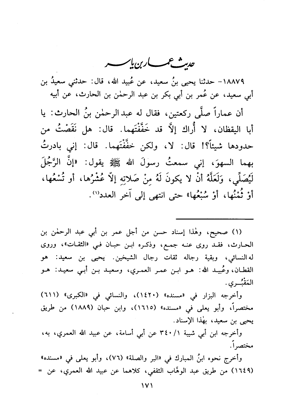 ١٨٨٧٩ - حَدَّثَنَا يَحْيَى بْنُ سَعِيدٍ، عَنْ عُبَيْدِ اللهِ، قَالَ: حَدَّثَنِي سَعِيدُ بْنُ أَبِي سَعِيدٍ، عَنْ عُمَرَ بْنِ أَبِي بَكْرِ بْنِ عَبْدِ الرَّحْمَنِ بْنِ الْحَارِثِ، عَنْ أَبِيهِ، أَنَّ عَمَّارًا، صَلَّى رَكْعَتَيْنِ، فَقَالَ لَهُ عَبْدُ الرَّحْمَنِ بْنُ الْحَارِثِ: يَا أَبَا الْيَقْظَانِ، لَا أَرَاكَ إِلَّا قَدْ خَفَّفْتَهُمَا، قَالَ: هَلْ نَقَصْتُ مِنْ حُدُودِهَا شَيْئًا؟ قَالَ: لَا، وَلَكِنْ خَفَّفْتَهُمَا قَالَ: إِنِّي بَادَرْتُ بِهِمَا السَّهْوَ، إِنِّي سَمِعْتُ رَسُولَ اللهِ صَلَّى اللهُ عَلَيْهِ وَسَلَّمَ يَقُولُ: " إِنَّ الرَّجُلَ لَيُصَلِّي، وَلَعَلَّهُ أَنْ لَا يَكُونَ لَهُ مِنْ صَلَاتِهِ إِلَّا عُشْرُهَا، وَتُسْعُهَا، أَوْ ثُمُنُهَا، أَوْ سُبُعُهَا " حَتَّى انْتَهَى إِلَى آخِرِ الْعَدَدِ (١)