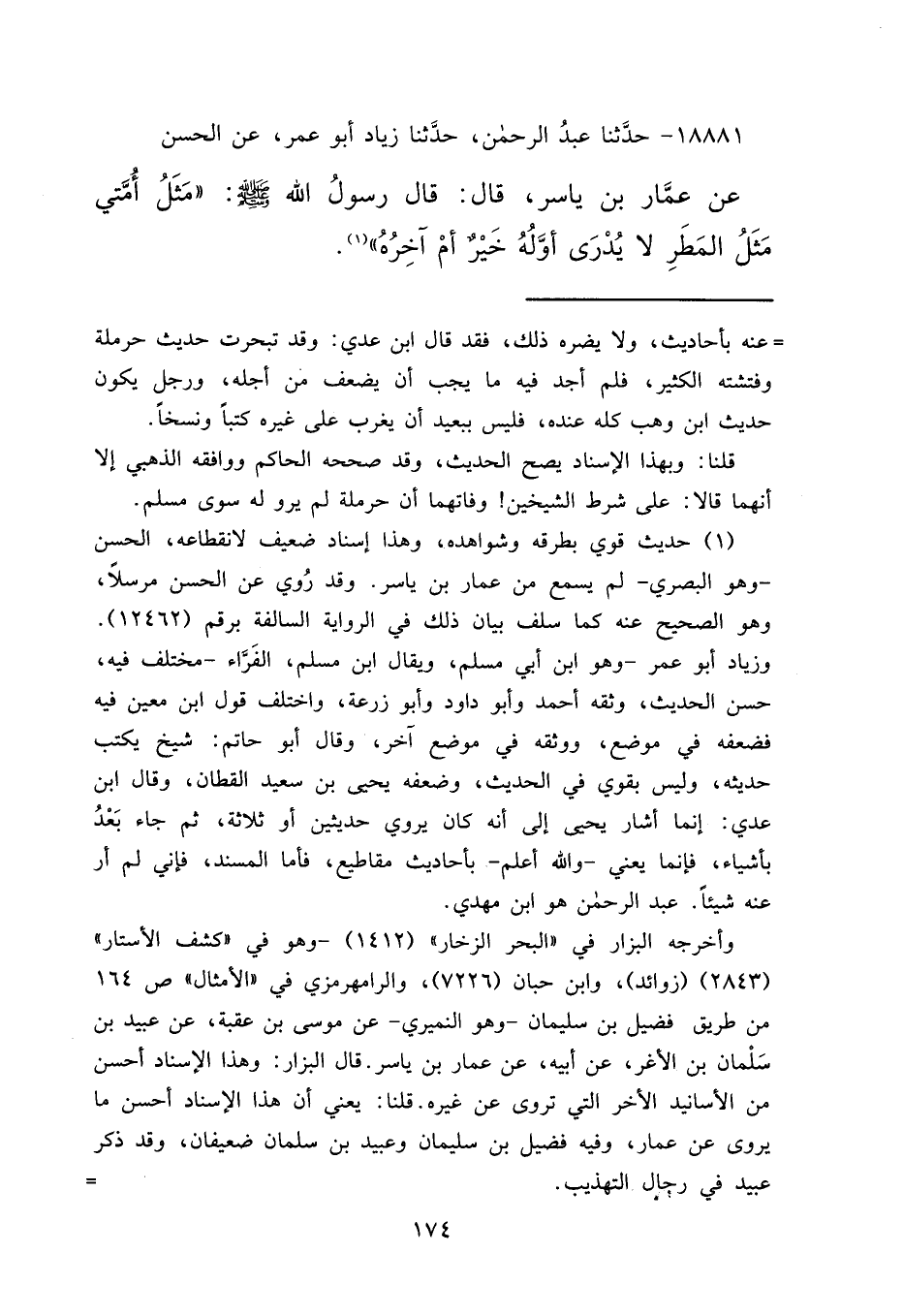 ١٨٨٨١ - حَدَّثَنَا عَبْدُ الرَّحْمَنِ، حَدَّثَنَا زِيَادٌ أَبُو عُمَرَ، عَنِ الْحَسَنِ، عَنْ عَمَّارِ بْنِ يَاسِرٍ قَالَ: قَالَ رَسُولُ اللهِ صَلَّى اللهُ عَلَيْهِ وَسَلَّمَ: " مَثَلُ أُمَّتِي مَثَلُ الْمَطَرِ لَا يُدْرَى أَوَّلُهُ خَيْرٌ أَمْ آخِرُهُ " (١)