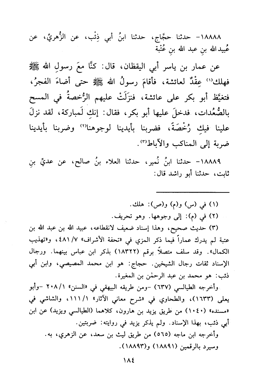 ١٨٨٨٨ - حَدَّثَنَا حَجَّاجٌ، حَدَّثَنَا ابْنُ أَبِي ذِئْبٍ، عَنِ الزُّهْرِيِّ، عَنْ عُبَيْدِ اللهِ بْنِ عَبْدِ اللهِ بْنِ عُتْبَةَ، عَنْ عَمَّارِ بْنِ يَاسِرٍ أَبِي الْيَقْظَانِ، قَالَ: " كُنَّا مَعَ رَسُولِ اللهِ صَلَّى اللهُ عَلَيْهِ وَسَلَّمَ، فَهَلَكَ (١) عِقْدٌ لِعَائِشَةَ، فَأَقَامَ رَسُولُ اللهِ صَلَّى اللهُ عَلَيْهِ وَسَلَّمَ حَتَّى أَضَاءَ الْفَجْرُ، فَتَغَيَّظَ أَبُو بَكْرٍ عَلَى عَائِشَةَ، فَنَزَلَتْ عَلَيْهِمُ الرُّخْصَةُ فِي الْمَسْحِ بِالصُّعُدَاتِ "، فَدَخَلَ عَلَيْهَا أَبُو بَكْرٍ فَقَالَ: إِنَّكِ لَمُبَارَكَةٌ، لَقَدْ نَزَلَ عَلَيْنَا فِيكِ رُخْصَةٌ، فَضَرَبْنَا بِأَيْدِينَا لِوُجُوهِنَا، (٢) وَضَرَبْنَا بِأَيْدِينَا ضَرْبَةً إِلَى الْمَنَاكِبِ وَالْآبَاطِ (٣)