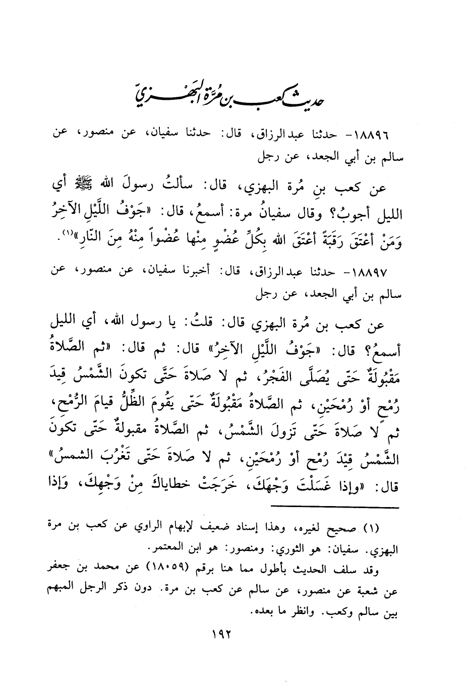 ١٨٨٩٧ - حَدَّثَنَا عَبْدُ الرَّزَّاقِ، قَالَ: أَخْبَرَنَا سُفْيَانُ، عَنْ مَنْصُورٍ، عَنْ سَالِمِ بْنِ أَبِي الْجَعْدِ، عَنْ رَجُلٍ، عَنْ كَعْبِ بْنِ مُرَّةَ الْبَهْزِيِّ قَالَ: قُلْتُ: يَا رَسُولَ اللهِ، أَيُّ اللَّيْلِ أَسْمَعُ؟ قَالَ: " جَوْفُ اللَّيْلِ الْآخِرِ " قَالَ: ثُمَّ قَالَ: " ثُمَّ الصَّلَاةُ مَقْبُولَةٌ حَتَّى يُصَلَّى الْفَجْرُ، ثُمَّ لَا صَلَاةَ حَتَّى تَكُونَ الشَّمْسُ قِيدَ رُمْحٍ أَوْ رُمْحَيْنِ، ثُمَّ الصَّلَاةُ مَقْبُولَةٌ حَتَّى يَقُومَ الظِّلُّ قِيَامَ الرُّمْحِ، ثُمَّ لَا صَلَاةَ حَتَّى تَزُولَ الشَّمْسُ، ثُمَّ الصَّلَاةُ مَقْبُولَةٌ حَتَّى تَكُونَ الشَّمْسُ قِيدَ رُمْحٍ أَوْ رُمْحَيْنِ، ثُمَّ لَا صَلَاةَ حَتَّى تَغْرُبَ الشَّمْسُ " قَالَ: " إِذَا غَسَلْتَ وَجْهَكَ خَرَجَتْ خَطَايَاكَ مِنْ وَجْهِكَ، وَإِذَا