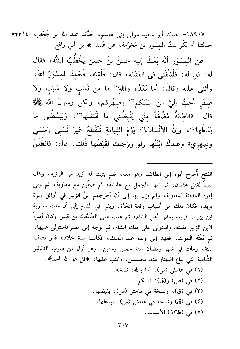١٨٩٠٧ - حَدَّثَنَا أَبُو سَعِيدٍ، مَوْلَى بَنِي هَاشِمٍ، حَدَّثَنَا عَبْدُ اللهِ بْنُ جَعْفَرٍ، حَدَّثَتْنَا أُمُّ بَكْرٍ بِنْتُ الْمِسْوَرِ بْنِ مَخْرَمَةَ، عَنْ عُبَيْدِ اللهِ بْنِ أَبِي رَافِعٍ، عَنِ الْمِسْوَرِ، أَنَّهُ بَعَثَ إِلَيْهِ حَسَنُ بْنُ حَسَنٍ يَخْطُبُ ابْنَتَهُ، فَقَالَ لَهُ: قُلْ لَهُ: فَلْيَلْقَنِي فِي الْعَتَمَةِ، قَالَ: فَلَقِيَهُ، فَحَمِدَ الْمِسْوَرُ اللهَ وَأَثْنَى عَلَيْهِ وَقَالَ: أَمَّا بَعْدُ، وَاللهِ (١) مَا مِنْ نَسَبٍ، وَلَا سَبَبٍ، وَلَا صِهْرٍ، أَحَبُّ إِلَيَّ مِنْ سَبَبِكُمْ (٢) وَصِهْرِكُمْ، وَلَكِنَّ رَسُولَ اللهِ صَلَّى اللهُ عَلَيْهِ وَسَلَّمَ قَالَ: " فَاطِمَةُ مُضْغَةٌ مِنِّي، يَقْبِضُنِي مَا قَبَضَهَا، (٣) وَيَبْسُطُنِي مَا بَسَطَهَا، (٤) وَإِنَّ الْأَنْسَابَ (٥) يَوْمَ الْقِيَامَةِ تَنْقَطِعُ غَيْرَ نَسَبِي، وَسَبَبِي، وَصِهْرِي "، وَعِنْدَكَ ابْنَتُهَا وَلَوْ زَوَّجْتُكَ لَقَبَضَهَا ذَلِكَ قَالَ: فَانْطَلَقَ