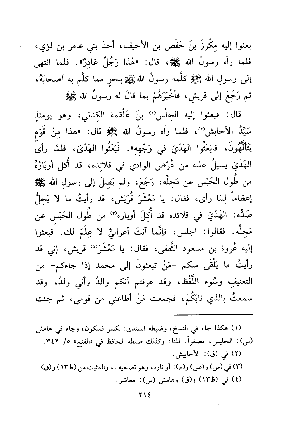 بَعَثُوا إِلَيْهِ مِكْرَزَ بْنَ حَفْصِ بْنِ الْأَخْيَفِ، أَحَدَ بَنِي عَامِرِ بْنِ لُؤَيٍّ، فَلَمَّا رَآهُ رَسُولُ اللهِ صَلَّى اللهُ عَلَيْهِ وَسَلَّمَ، قَالَ: " هَذَا رَجُلٌ غَادِرٌ ". فَلَمَّا انْتَهَى إِلَى رَسُولِ اللهِ صَلَّى اللهُ عَلَيْهِ وَسَلَّمَ كَلَّمَهُ رَسُولُ اللهِ صَلَّى اللهُ عَلَيْهِ وَسَلَّمَ بِنَحْوٍ مِمَّا كَلَّمَ بِهِ أَصْحَابَهُ، ثُمَّ رَجَعَ إِلَى قُرَيْشٍ، فَأَخْبَرَهُمْ بِمَا قَالَ لَهُ رَسُولُ اللهِ صَلَّى اللهُ عَلَيْهِ وَسَلَّمَ. قَالَ: فَبَعَثُوا إِلَيْهِ الْحِلْسَ (١) بْنَ عَلْقَمَةَ الْكِنَانِيَّ، وَهُوَ يَوْمَئِذٍ سَيِّدُ الْأَحَابِشِ، (٢) فَلَمَّا رَآهُ رَسُولُ اللهِ صَلَّى اللهُ عَلَيْهِ وَسَلَّمَ قَالَ: " هَذَا مِنْ قَوْمٍ يَتَأَلَّهُونَ، فَابْعَثُوا الْهَدْيَ فِي وَجْهِهِ ". فَبَعَثُوا الْهَدْيَ، فَلَمَّا رَأَى الْهَدْيَ يَسِيلُ عَلَيْهِ مِنْ عَرْضِ الْوَادِي فِي قَلَائِدِهِ، قَدْ أَكَلَ أَوْتَارَهُ (٣) مِنْ طُولِ الْحَبْسِ عَنْ مَحِلِّهِ، رَجَعَ، وَلَمْ يَصِلْ إِلَى رَسُولِ اللهِ صَلَّى اللهُ عَلَيْهِ وَسَلَّمَ إِعْظَامًا لِمَا رَأَى، فَقَالَ: يَا مَعْشَرَ (٤) قُرَيْشٍ، قَدْ رَأَيْتُ مَا لَا يَحِلُّ صَدُّهُ: الْهَدْيَ فِي قَلَائِدِهِ قَدْ أَكَلَ أَوْتَارَهُ مِنْ طُولِ الْحَبْسِ عَنْ مَحِلِّهِ. فَقَالُوا: اجْلِسْ، إِنَّمَا أَنْتَ أَعْرَابِيٌّ لَا عِلْمَ لَكَ، فَبَعَثُوا إِلَيْهِ عُرْوَةَ بْنَ مَسْعُودٍ الثَّقَفِيَّ، فَقَالَ: يَا مَعْشَرَ قُرَيْشٍ، إِنِّي قَدْ رَأَيْتُ مَا يَلْقَى مِنْكُمْ، مَنْ تَبْعَثُونَ إِلَى مُحَمَّدٍ إِذَا جَاءَكُمْ، مِنَ التَّعْنِيفِ وَسُوءِ اللَّفْظِ، وَقَدْ عَرَفْتُمْ أَنَّكُمْ وَالِدٌ وَأَنِّي وَلَدٌ، وَقَدْ سَمِعْتُ بِالَّذِي نَابَكُمْ، فَجَمَعْتُ مَنْ أَطَاعَنِي مِنْ قَوْمِي، ثُمَّ جِئْتُ