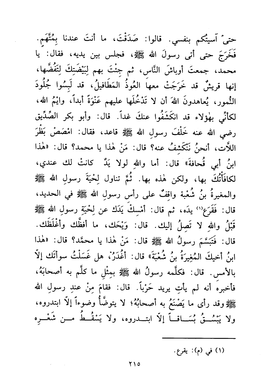 حَتَّى آسَيْتُكُمْ بِنَفْسِي. قَالُوا: صَدَقْتَ، مَا أَنْتَ عِنْدَنَا بِمُتَّهَمٍ. فَخَرَجَ حَتَّى أَتَى رَسُولَ اللهِ صَلَّى اللهُ عَلَيْهِ وَسَلَّمَ، فَجَلَسَ بَيْنَ يَدَيْهِ، فَقَالَ: يَا مُحَمَّدُ، جَمَعْتَ أَوْبَاشَ النَّاسِ، ثُمَّ جِئْتَ بِهِمْ لِبَيْضَتِكَ لِتَفُضَّهَا، إِنَّهَا قُرَيْشٌ قَدْ خَرَجَتْ مَعَهَا الْعُوذُ الْمَطَافِيلُ، قَدْ لَبِسُوا جُلُودَ النُّمُورِ، يُعَاهِدُونَ اللهَ أَنْ لَا تَدْخُلَهَا عَلَيْهِمْ عَنْوَةً أَبَدًا، وَأَيْمُ اللهِ، لَكَأَنِّي بِهَؤُلَاءِ قَدْ انْكَشَفُوا عَنْكَ غَدًا. قَالَ: وَأَبُو بَكْرٍ الصِّدِّيقُ خَلْفَ رَسُولِ اللهِ صَلَّى اللهُ عَلَيْهِ وَسَلَّمَ قَاعِدٌ، فَقَالَ: امْصُصْ بَظْرَ اللَّاتِ، أَنَحْنُ نَنْكَشِفُ عَنْهُ؟ قَالَ: مَنْ هَذَا يَا مُحَمَّدُ؟ قَالَ: " هَذَا ابْنُ أَبِي قُحَافَةَ " قَالَ: وَاللهِ لَوْلَا يَدٌ كَانَتْ لَكَ عِنْدِي، لَكَافَأْتُكَ بِهَا، وَلَكِنَّ هَذِهِ بِهَا. ثُمَّ تَنَاوَلَ لِحْيَةَ رَسُولِ اللهِ صَلَّى اللهُ عَلَيْهِ وَسَلَّمَ وَالْمُغِيرَةُ بْنُ شُعْبَةَ وَاقِفٌ عَلَى رَأْسِ رَسُولِ اللهِ صَلَّى اللهُ عَلَيْهِ وَسَلَّمَ فِي الْحَدِيدِ، قَالَ: يَقْرَعُ (١) يَدَهُ، ثُمَّ قَالَ: أَمْسِكْ يَدَكَ عِنْ لِحْيَةِ رَسُولِ اللهِ صَلَّى اللهُ عَلَيْهِ وَسَلَّمَ قَبْلَ وَاللهِ لَا تَصِلُ إِلَيْكَ. قَالَ: وَيْحَكَ، مَا أَفَظَّكَ وَأَغْلَظَكَ. قَالَ: فَتَبَسَّمَ رَسُولُ اللهِ صَلَّى اللهُ عَلَيْهِ وَسَلَّمَ قَالَ: مَنْ هَذَا يَا مُحَمَّدُ؟ قَالَ: " هَذَا ابْنُ أَخِيكَ الْمُغِيرَةُ بْنُ شُعْبَةَ " قَالَ: أَغُدَرُ، هَلْ غَسَلْتَ سَوْأَتَكَ إِلَّا بِالْأَمْسِ. قَالَ: فَكَلَّمَهُ رَسُولُ اللهِ صَلَّى اللهُ عَلَيْهِ وَسَلَّمَ بِمِثْلِ مَا كَلَّمَ بِهِ أَصْحَابَهُ، فَأَخْبَرَهُ أَنَّهُ لَمْ يَأْتِ يُرِيدُ حَرْبًا. قَالَ: فَقَامَ مِنْ عِنْدِ رَسُولِ اللهِ صَلَّى اللهُ عَلَيْهِ وَسَلَّمَ وَقَدْ رَأَى مَا يَصْنَعُ بِهِ أَصْحَابُهُ، لَا يَتَوَضَّأُ وُضُوءًا إِلَّا ابْتَدَرُوهُ، وَلَا يَبْسُقُ بُسَاقًا إِلَّا ابْتَدَرُوهُ، وَلَا يَسْقُطُ مِنْ شَعَرِهِ