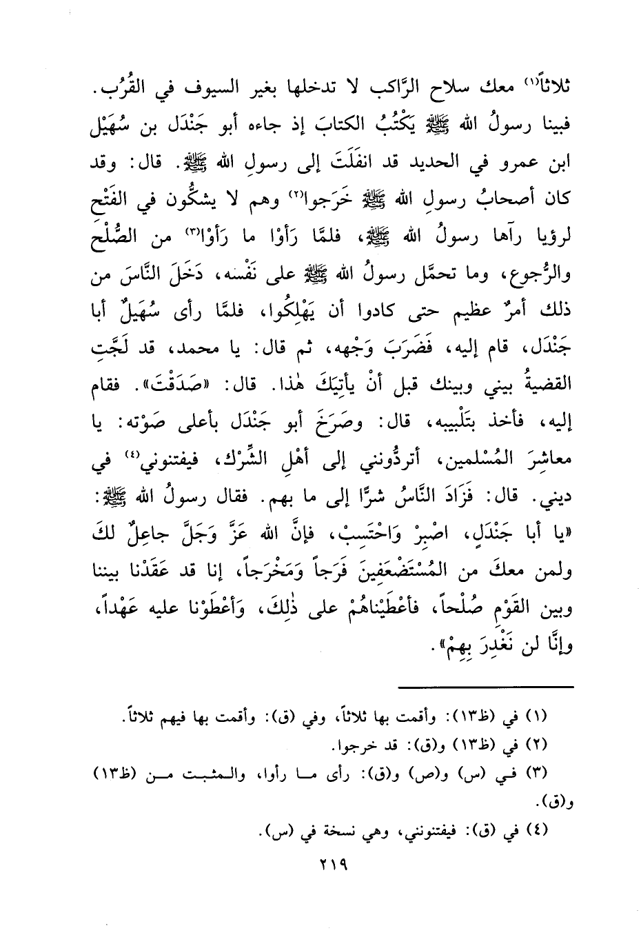 ثَلَاثًا (١) مَعَكَ سِلَاحُ الرَّاكِبِ لَا تَدْخُلْهَا بِغَيْرِ السُّيُوفِ فِي الْقُرُبِ. فَبَيْنَا رَسُولُ اللهِ صَلَّى اللهُ عَلَيْهِ وَسَلَّمَ يَكْتُبُ الْكِتَابَ إِذْ جَاءَهُ أَبُو جَنْدَلِ بْنُ سُهَيْلِ بْنِ عَمْرٍو فِي الْحَدِيدِ قَدِ انْفَلَتَ إِلَى رَسُولِ اللهِ صَلَّى اللهُ عَلَيْهِ وَسَلَّمَ. قَالَ: وَقَدْ كَانَ أَصْحَابُ رَسُولِ اللهِ صَلَّى اللهُ عَلَيْهِ وَسَلَّمَ خَرَجُوا (٢) وَهُمْ لَا يَشُكُّونَ فِي الْفَتْحِ لِرُؤْيَا رَآهَا رَسُولُ اللهِ صَلَّى اللهُ عَلَيْهِ وَسَلَّمَ، فَلَمَّا رَأَوْا مَا رَأَوْا (٣) مِنَ الصُّلْحِ وَالرُّجُوعِ، وَمَا تَحَمَّلَ رَسُولُ اللهِ صَلَّى اللهُ عَلَيْهِ وَسَلَّمَ عَلَى نَفْسِهِ، دَخَلَ النَّاسَ مِنْ ذَلِكَ أَمْرٌ عَظِيمٌ حَتَّى كَادُوا أَنْ يَهْلَكُوا، فَلَمَّا رَأَى سُهَيْلٌ أَبَا جَنْدَلٍ، قَامَ إِلَيْهِ، فَضَرَبَ وَجْهَهُ، ثُمَّ قَالَ: يَا مُحَمَّدُ، قَدْ لُجَّتِ الْقَضِيَّةُ بَيْنِي وَبَيْنَكَ قَبْلَ أَنْ يَأْتِيَكَ هَذَا. قَالَ: " صَدَقْتَ ". فَقَامَ إِلَيْهِ، فَأَخَذَ بِتَلْبِيبِهِ، قَالَ: وَصَرَخَ أَبُو جَنْدَلٍ بِأَعْلَى صَوْتِهِ: يَا مَعَاشِرَ الْمُسْلِمِينَ، أَتَرُدُّونَنِي إِلَى أَهْلِ الشِّرْكِ، فَيَفْتِنُونِي (٤) فِي دِينِي. قَالَ: فَزَادَ النَّاسُ شَرًّا إِلَى مَا بِهِمْ. فَقَالَ رَسُولُ اللهِ صَلَّى اللهُ عَلَيْهِ وَسَلَّمَ: " يَا أَبَا جَنْدَلٍ اصْبِرْ وَاحْتَسِبْ، فَإِنَّ اللهَ عَزَّ وَجَلَّ جَاعِلٌ لَكَ وَلِمَنْ مَعَكَ مِنَ الْمُسْتَضْعَفِينَ فَرَجًا وَمَخْرَجًا، إِنَّا قَدْ عَقَدْنَا بَيْنَنَا وَبَيْنَ الْقَوْمِ صُلْحًا، فَأَعْطَيْنَاهُمْ عَلَى ذَلِكَ، وَأَعْطَوْنَا عَلَيْهِ عَهْدًا، وَإِنَّا لَنْ نَغْدِرَ بِهِمْ ".