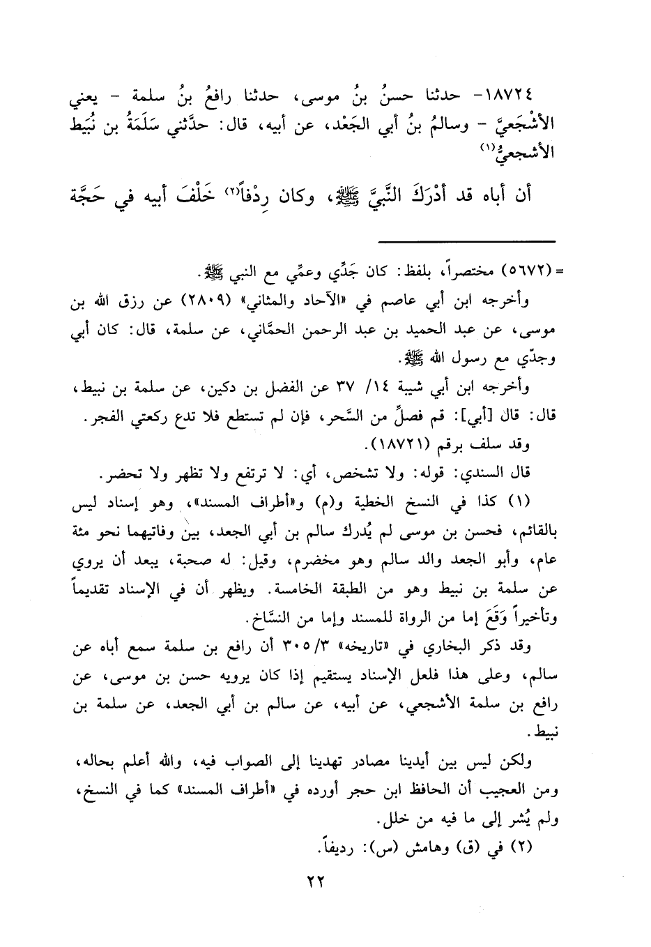 (١) كذا في النسخ الخطية و (م) و"أطراف المسند"، وهو إسناد ليس بالقائم، فحسن بن موسى لم يُدرك سالم بن أبي الجعد، بين وفاتيهما نحو مئة عام، وأبو الجعد والد سالم وهو مخضرم، وقيل: له صحبة، يبعد أن يروي عن سلمة بن نبيط وهو من الطبقة الخامسة. ويظهر أن في الإسناد تقديماً