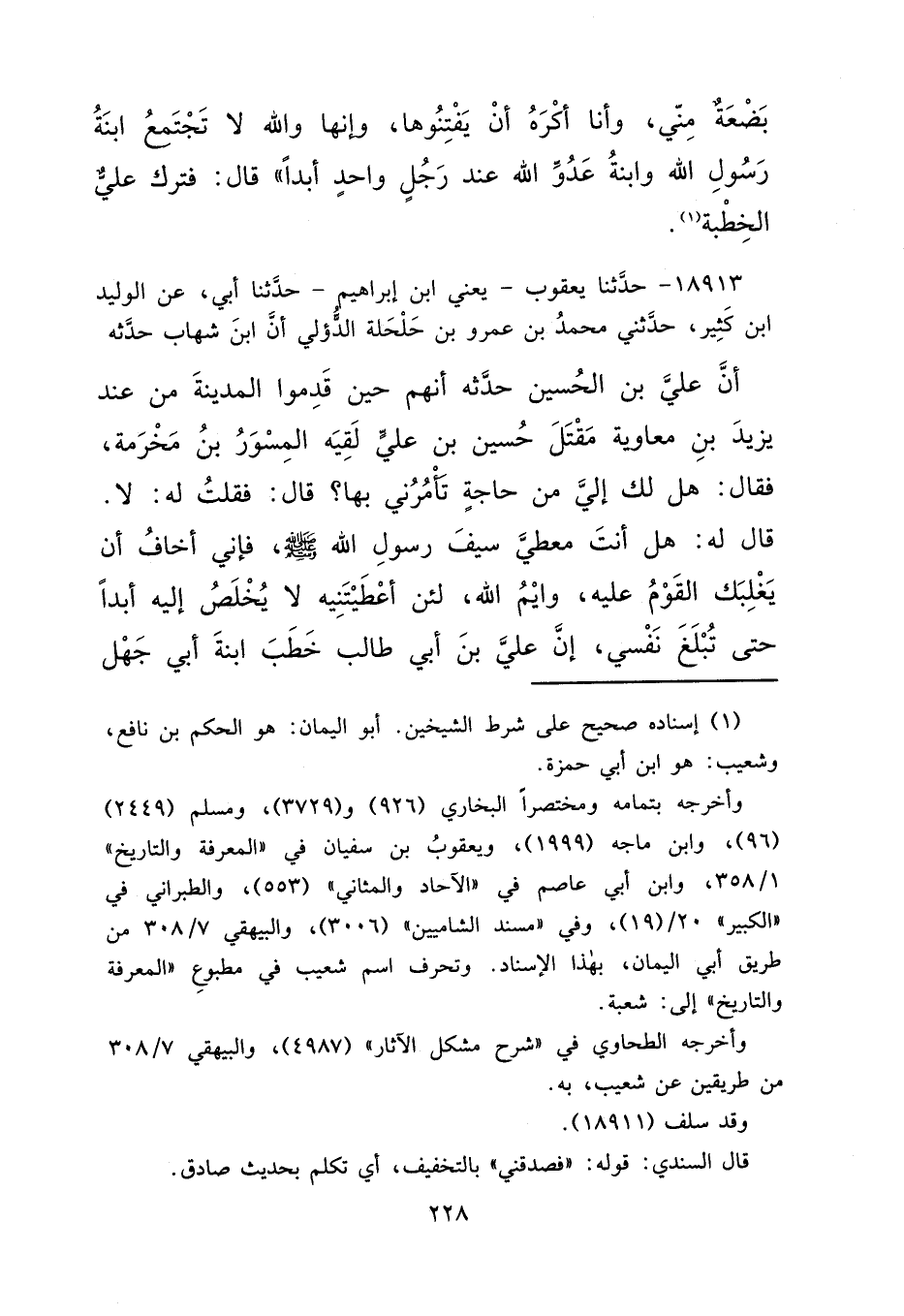 ١٨٩١٣ - حَدَّثَنَا يَعْقُوبُ يَعْنِي ابْنَ إِبْرَاهِيمَ، حَدَّثَنَا أَبِي، عَنِ الْوَلِيدِ بْنِ كَثِيرٍ، حَدَّثَنِي مُحَمَّدُ بْنُ عَمْرِو بْنِ حَلْحَلَةَ الدُّؤَلِيُّ، أَنَّ ابْنَ شِهَابٍ حَدَّثَهُ، أَنَّ عَلِيَّ بْنَ الْحُسَيْنِ حَدَّثَهُ، أَنَّهُمْ حِينَ قَدِمُوا الْمَدِينَةَ مِنْ عِنْدِ يَزِيدَ بْنِ مُعَاوِيَةَ مَقْتَلَ حُسَيْنِ بْنِ عَلِيٍّ لَقِيَهُ الْمِسْوَرُ بْنُ مَخْرَمَةَ فَقَالَ: هَلْ لَكَ إِلَيَّ مِنْ حَاجَةٍ تَأْمُرُنِي بِهَا؟ قَالَ: فَقُلْتُ لَهُ: لَا، قَالَ لَهُ: هَلْ أَنْتَ مُعْطِيَّ سَيْفَ رَسُولِ اللهِ صَلَّى اللهُ عَلَيْهِ وَسَلَّمَ؟ فَإِنِّي أَخَافُ أَنْ يَغْلِبَكَ الْقَوْمُ عَلَيْهِ، وَايْمُ اللهِ، لَئِنْ أَعْطَيْتَنِيهِ لَا يُخْلَصُ إِلَيْهِ أَبَدًا حَتَّى تَبْلُغَ نَفْسِي، إِنَّ عَلِيَّ بْنَ أَبِي طَالِبٍ خَطَبَ ابْنَةَ أَبِي جَهْلٍ