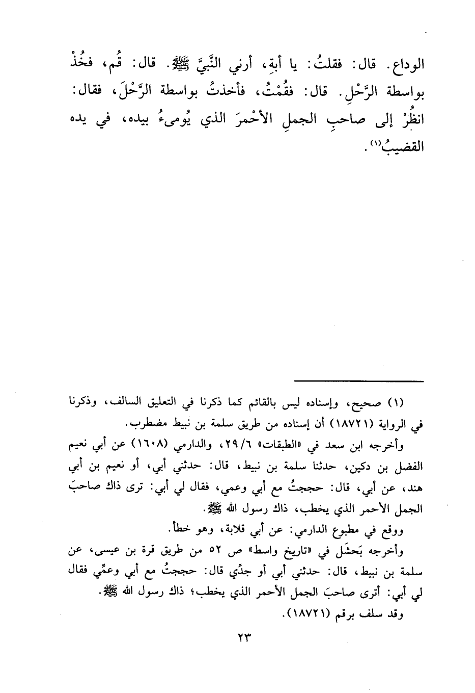 الْوَدَاعِ قَالَ: فَقُلْتُ: يَا أَبةْ أَرِنِي النَّبِيَّ صَلَّى اللهُ عَلَيْهِ وَسَلَّمَ، قَالَ: قُمْ فَخُذْ بِوَاسِطَةِ الرَّحْلِ قَالَ: فَقُمْتُ فَأَخَذْتُ بِوَاسِطَةِ الرَّحْلِ، فَقَالَ: " انْظُرْ إِلَى صَاحِبِ الْجَمَلِ الْأَحْمَرِ الَّذِي يُومِئُ بِيَدِهِ فِي يَدِهِ الْقَضِيبُ " (١)
