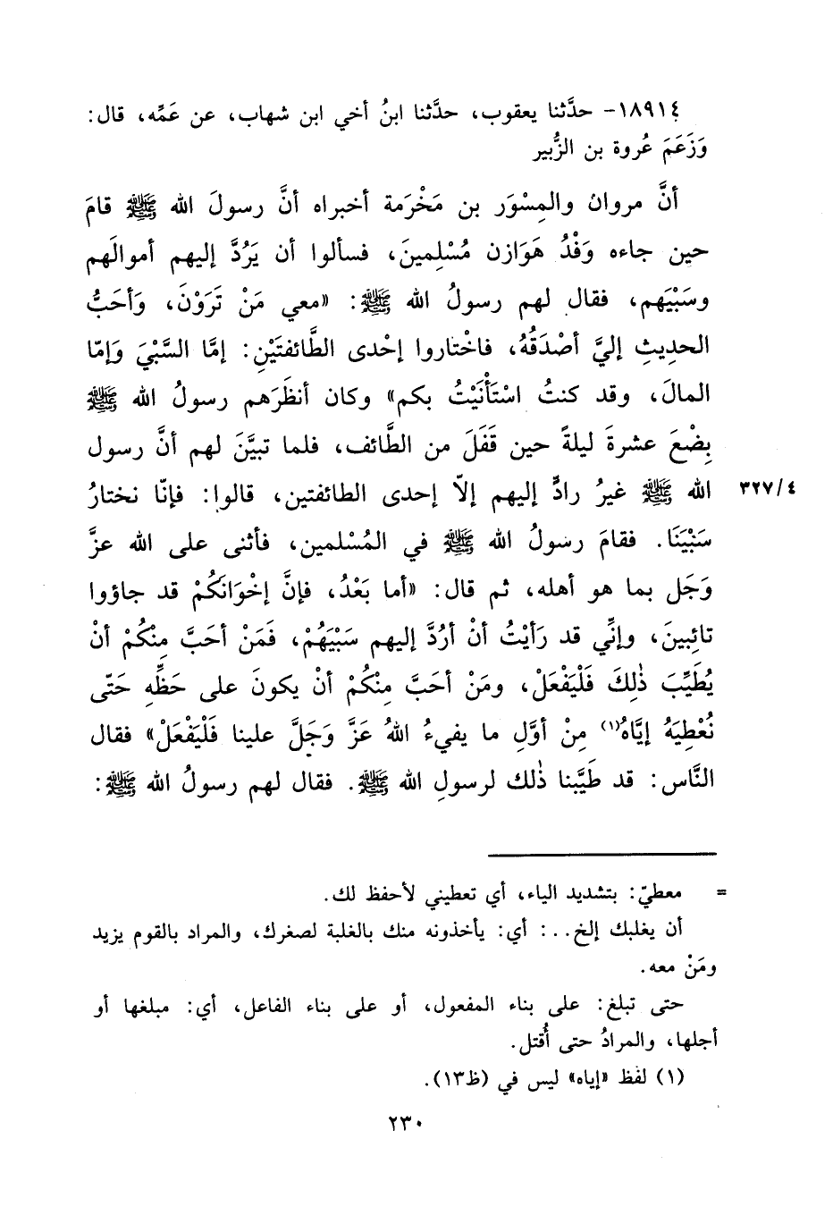 ١٨٩١٤ - حَدَّثَنَا يَعْقُوبُ، حَدَّثَنَا ابْنُ أَخِي ابْنِ شِهَابٍ، عَنْ عَمِّهِ، قَالَ: وَزَعَمَ عُرْوَةُ بْنُ الزُّبَيْرِ، أَنَّ مَرْوَانَ، وَالْمِسْوَرَ بْنَ مَخْرَمَةَ أَخْبَرَاهُ، أَنَّ رَسُولَ اللهِ صَلَّى اللهُ عَلَيْهِ وَسَلَّمَ قَامَ حِينَ جَاءَهُ وَفْدُ هَوَازِنَ مُسْلِمِينَ، فَسَأَلُوا أَنْ يَرُدَّ إِلَيْهِمْ أَمْوَالَهُمْ وَسَبْيَهُمْ، فَقَالَ لَهُمْ رَسُولُ اللهِ صَلَّى اللهُ عَلَيْهِ وَسَلَّمَ: " مَعِي مَنْ تَرَوْنَ، وَأَحَبُّ الْحَدِيثِ إِلَيَّ أَصْدَقُهُ، فَاخْتَارُوا إِحْدَى الطَّائِفَتَيْنِ: إِمَّا السَّبْيُ وَإِمَّا الْمَالُ، وَقَدْ كُنْتُ اسْتَأْنَيْتُ بِكُمْ " وَكَانَ أَنْظَرَهُمْ رَسُولُ اللهِ صَلَّى اللهُ عَلَيْهِ وَسَلَّمَ بِضْعَ عَشْرَةَ لَيْلَةً حِينَ قَفَلَ مِنَ الطَّائِفِ، فَلَمَّا تَبَيَّنَ لَهُمْ أَنَّ رَسُولَ اللهِ صَلَّى اللهُ عَلَيْهِ وَسَلَّمَ غَيْرُ رَادٍّ إِلَيْهِمْ إِلَّا إِحْدَى الطَّائِفَتَيْنِ، قَالُوا: فَإِنَّا نَخْتَارُ سَبْيَنَا. فَقَامَ رَسُولُ اللهِ صَلَّى اللهُ عَلَيْهِ وَسَلَّمَ فِي الْمُسْلِمِينَ فَأَثْنَى عَلَى اللهِ عَزَّ وَجَلَّ بِمَا هُوَ أَهْلُهُ، ثُمَّ قَالَ: " أَمَّا بَعْدُ فَإِنَّ إِخْوَانَكُمْ قَدْ جَاءُوا تَائِبِينَ، وَإِنِّي قَدْ رَأَيْتُ أَنْ أَرُدَّ إِلَيْهِمْ سَبْيَهُمْ، فَمَنْ أَحَبَّ مِنْكُمْ أَنْ يُطَيِّبَ ذَلِكَ، فَلْيَفْعَلْ، وَمَنْ أَحَبَّ مِنْكُمْ أَنْ يَكُونَ عَلَى حَظِّهِ حَتَّى نُعْطِيَهُ إِيَّاهُ (١) مِنْ أَوَّلِ مَا يُفِيءُ اللهُ عَزَّ وَجَلَّ عَلَيْنَا، فَلْيَفْعَلْ " فَقَالَ النَّاسُ: قَدْ طَيَّبْنَا ذَلِكَ لِرَسُولِ اللهِ صَلَّى اللهُ عَلَيْهِ وَسَلَّمَ، فَقَالَ لَهُمْ رَسُولُ اللهِ صَلَّى اللهُ عَلَيْهِ وَسَلَّمَ: "