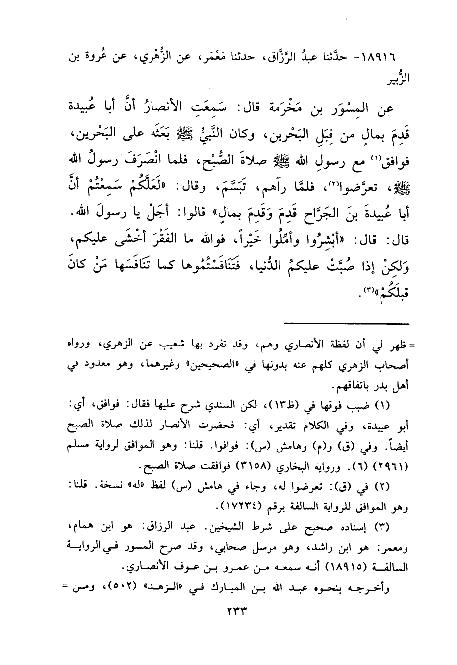 ١٨٩١٦ - حَدَّثَنَا عَبْدُ الرَّزَّاقِ، حَدَّثَنَا مَعْمَرٌ، عَنِ الزُّهْرِيِّ، عَنْ عُرْوَةَ بْنِ الزُّبَيْرِ، عَنِ الْمِسْوَرِ بْنِ مَخْرَمَةَ قَالَ: سَمِعَتِ الْأَنْصَارُ أَنَّ أَبَا عُبَيْدَةَ قَدِمَ بِمَالٍ مِنْ قِبَلِ الْبَحْرَيْنِ، وَكَانَ النَّبِيُّ صَلَّى اللهُ عَلَيْهِ وَسَلَّمَ بَعَثَهُ عَلَى الْبَحْرَيْنِ فَوَافَقَ (١) مَعَ رَسُولِ اللهِ صَلَاةَ الصُّبْحِ، فَلَمَّا انْصَرَفَ رَسُولُ اللهِ صَلَّى اللهُ عَلَيْهِ وَسَلَّمَ تَعَرَّضُوا، (٢) فَلَمَّا رَآهُمْ تَبَسَّمَ وَقَالَ: " لَعَلَّكُمْ سَمِعْتُمْ أَنَّ أَبَا عُبَيْدَةَ بْنَ الْجَرَّاحِ قَدِمَ وَقَدِمَ بِمَالٍ؟ " قَالُوا: أَجَلْ يَا رَسُولَ اللهِ، قَالَ: قَالَ: " أَبْشِرُوا وَأَمِّلُوا خَيْرًا، فَوَاللهِ مَا الْفَقْرُ أَخْشَى عَلَيْكُمْ، وَلَكِنْ إِذَا صُبَّتْ عَلَيْكُمُ الدُّنْيَا، فَتَنَافَسْتُمُوهَا كَمَا تَنَافَسَهَا مَنْ كَانَ قَبْلَكُمْ " (٣)