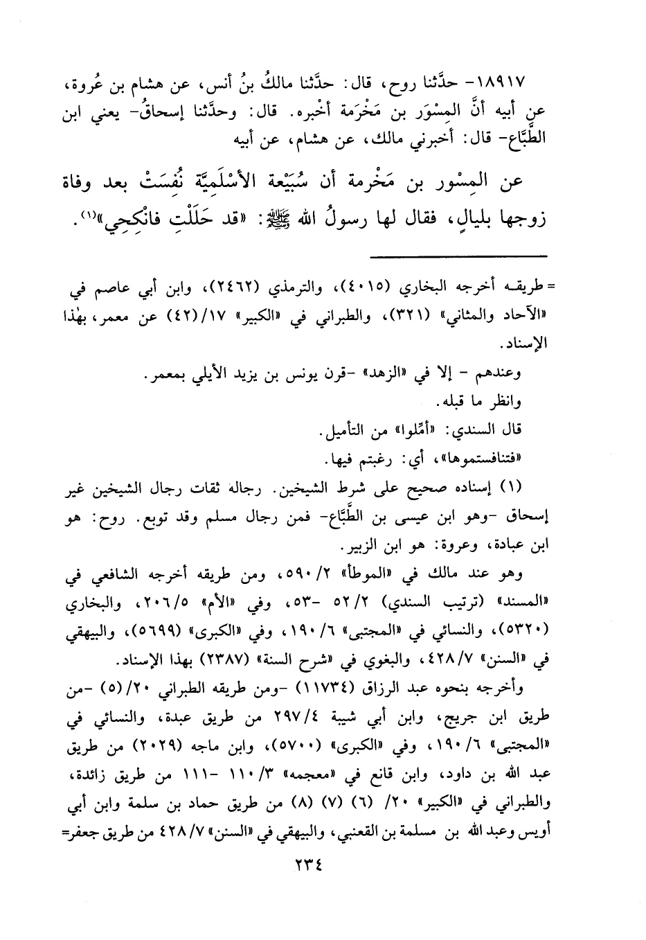 ١٨٩١٧ - حَدَّثَنَا رَوْحٌ، قَالَ: حَدَّثَنَا مَالِكُ بْنُ أَنَسٍ، عَنْ هِشَامِ بْنِ عُرْوَةَ، عَنْ أَبِيهِ، أَنَّ الْمِسْوَرَ بْنَ مَخْرَمَةَ، أخْبَرَهُ قَالَ: وحَدَّثَنَا إِسْحَاقُ يَعْنِي ابْنَ الطَّبَّاعِ، قَالَ: أَخْبَرَنِي مَالِكٌ، عَنْ هِشَامٍ، عَنْ أَبِيهِ، عَنِ الْمِسْوَرِ بْنِ مَخْرَمَةَ، أَنَّ سُبَيْعَةَ الْأَسْلَمِيَّةَ نُفِسَتْ بَعْدَ وَفَاةِ زَوْجِهَا بِلَيَالٍ، فَقَالَ لَهَا رَسُولُ اللهِ صَلَّى اللهُ عَلَيْهِ وَسَلَّمَ: " قَدْ حَلَلْتِ فَانْكِحِي " (١)