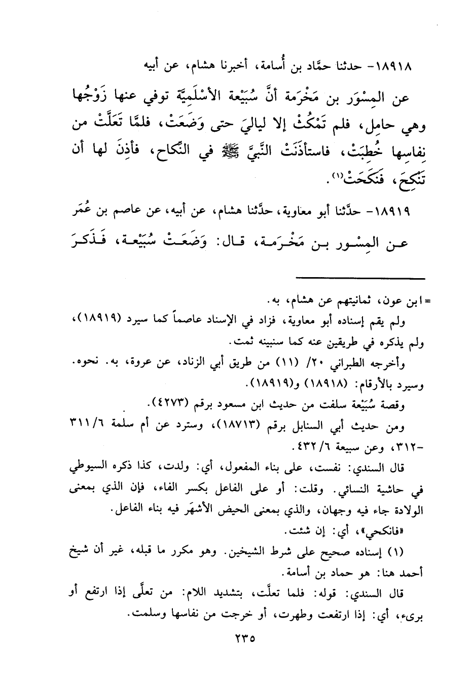ومن حديث أبي السنابل برقم (١٨٧١٣) ، وسترد عن أم سلمة ١/٣١٦ -٣١٢، وعن سبيعة ٦/٤٣٢.