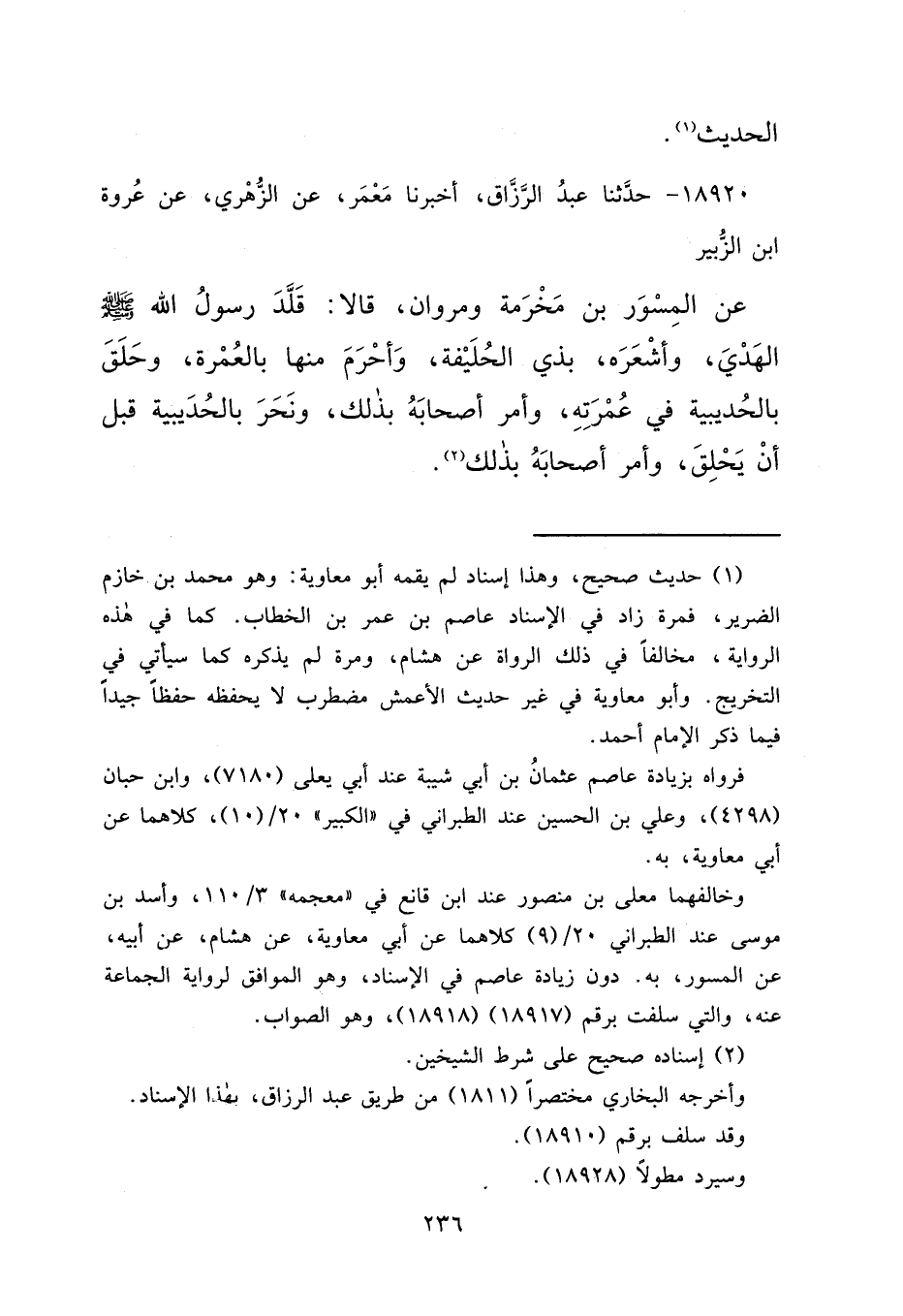 وخالفهما معلى بن منصور عند ابن قانع في "معجمه" ٣/١١٠، وأسد بن موسى عند الطبراني ٢٠/ (٩) كلاهما عن أبي معاوية، عن هشام، عن أبيه، عن المسور، به. دون زيادة عاصم في الإسناد، وهو الموافق لرواية الجماعة عنه، والتي سلفت برقم (١٨٩١٧) (١٨٩١٨) ، وهو الصواب.