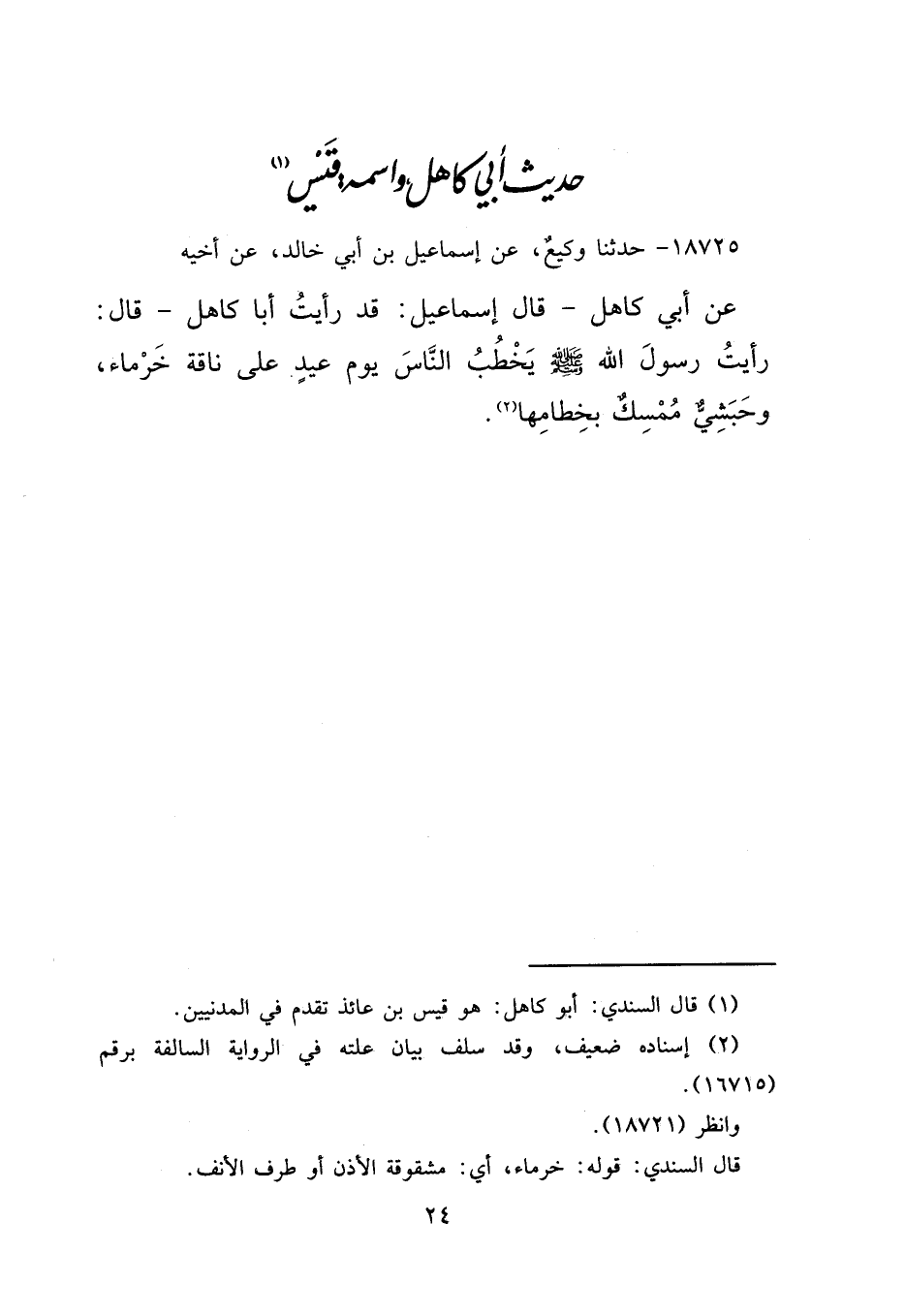 ١٨٧٢٥ - حَدَّثَنَا وَكِيعٌ، عَنْ إِسْمَاعِيلَ بْنِ أَبِي خَالِدٍ، عَنْ أَخِيهِ، عَنْ أَبِي كَاهِلٍ، قَالَ: إِسْمَاعِيلُ قَدْ رَأَيْتُ أَبَا كَاهِلٍ، قَالَ: " رَأَيْتُ رَسُولَ اللهِ صَلَّى اللهُ عَلَيْهِ وَسَلَّمَ يَخْطُبُ النَّاسَ يَوْمَ عِيدٍ عَلَى نَاقَةٍ خَرْمَاءَ، وَحَبَشِيٌّ مُمْسِكٌ بِخِطَامِهَا " (٢)