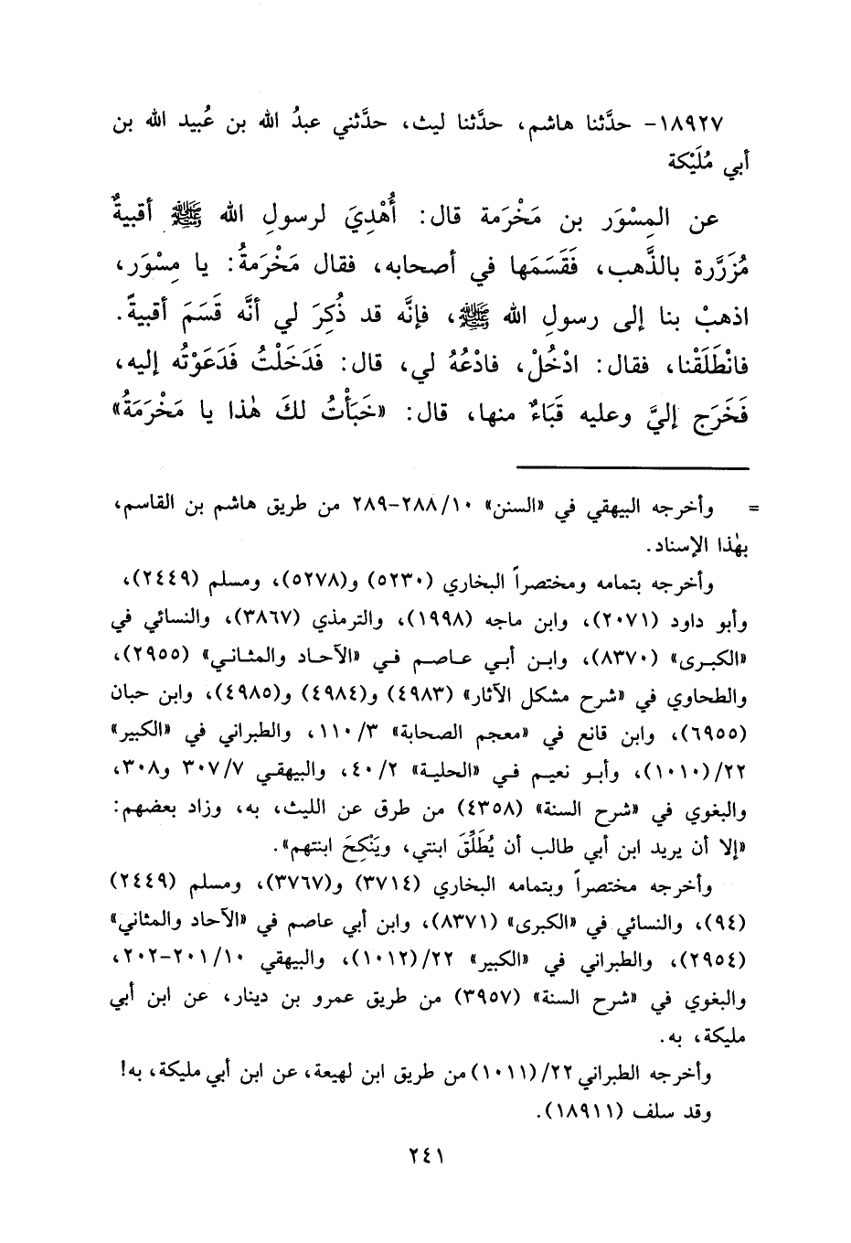 ١٨٩٢٧ - حَدَّثَنَا هَاشِمٌ، حَدَّثَنَا لَيْثٌ، حَدَّثَنِي عَبْدُ اللهِ بْنُ عُبَيْدِ اللهِ بْنِ أَبِي مُلَيْكَةَ، عَنِ الْمِسْوَرِ بْنِ مَخْرَمَةَ قَالَ: أُهْدِيَ لِرَسُولِ اللهِ صَلَّى اللهُ عَلَيْهِ وَسَلَّمَ أَقْبِيَةٌ مُزَرَّرَةٌ بِالذَّهَبِ، فَقَسَمَهَا فِي أَصْحَابِهِ، فَقَالَ مَخْرَمَةُ: يَا مِسْوَرُ، اذْهَبْ بِنَا إِلَى رَسُولِ اللهِ صَلَّى اللهُ عَلَيْهِ وَسَلَّمَ، فَإِنَّهُ قَدْ ذُكِرَ لِي أَنَّهُ قَسَمَ أَقْبِيَةً، فَانْطَلَقْنَا، فَقَالَ: ادْخُلْ، فَادْعُهُ لِي، قَالَ: فَدَخَلْتُ فَدَعَوْتُهُ إِلَيْهِ، فَخَرَجَ إِلَيَّ وَعَلَيْهِ قَبَاءٌ مِنْهَا، قَالَ: " خَبَأْتُ لَكَ هَذَا يَا مَخْرَمَةُ "