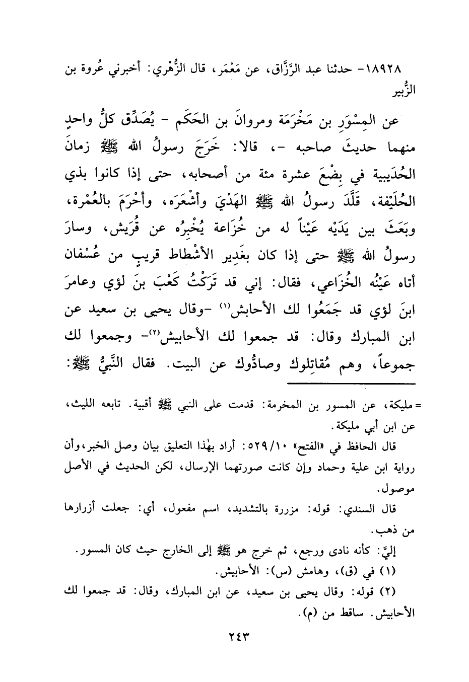 ١٨٩٢٨ - حَدَّثَنَا عَبْدُ الرَّزَّاقِ، عَنْ مَعْمَرٍ، قَالَ الزُّهْرِيُّ: أَخْبَرَنِي عُرْوَةُ بْنُ الزُّبَيْرِ، عَنِ الْمِسْوَرِ بْنِ مَخْرَمَةَ، وَمَرْوَانَ بَنِ الْحَكَمِ، يُصَدِّقُ كُلُّ وَاحِدٍ مِنْهُمَا حَدِيثَ صَاحِبِهِ قَالَا: خَرَجَ رَسُولُ اللهِ صَلَّى اللهُ عَلَيْهِ وَسَلَّمَ زَمَانَ الْحُدَيْبِيَةِ فِي بِضْعَ عَشْرَةَ مِائَةً مِنْ أَصْحَابِهِ، حَتَّى إِذَا كَانُوا بِذِي الْحُلَيْفَةِ، قَلَّدَ رَسُولُ اللهِ صَلَّى اللهُ عَلَيْهِ وَسَلَّمَ الْهَدْيَ وَأَشْعَرَهُ، وَأَحْرَمَ بِالْعُمْرَةِ، وَبَعَثَ بَيْنَ يَدَيْهِ عَيْنًا لَهُ مِنْ خُزَاعَةَ يُخْبِرُهُ عَنْ قُرَيْشٍ، وَسَارَ رَسُولُ اللهِ صَلَّى اللهُ عَلَيْهِ وَسَلَّمَ حَتَّى إِذَا كَانَ بِغَدِيرِ الْأَشْطَاطِ قَرِيبٌ مِنْ عُسْفَانَ، أَتَاهُ عَيْنُهُ الْخُزَاعِيُّ، فَقَالَ: إِنِّي قَدْ تَرَكْتُ كَعْبَ بْنَ لُؤَيٍّ وَعَامِرَ بْنَ لُؤَيٍّ قَدْ جَمَعُوا لَكَ الْأَحَابِشَ، (١) - وَقَالَ يَحْيَى بْنُ سَعِيدٍ عَنِ ابْنِ الْمُبَارَكِ وَقَالَ: قَدْ جَمَعُوا لَكَ الْأَحَابِيشَ (٢) - وَجَمَعُوا لَكَ جُمُوعًا وَهُمْ مُقَاتِلُوكَ وَصَادُّوكَ عَنِ الْبَيْتِ، فَقَالَ النَّبِيُّ صَلَّى اللهُ عَلَيْهِ وَسَلَّمَ: "