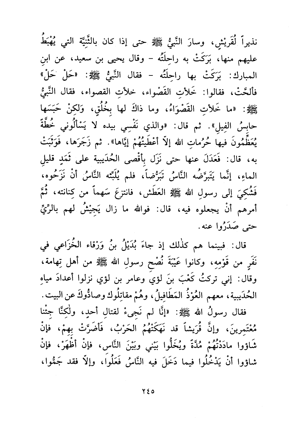 نَذِيرًا لِقُرَيْشٍ، وَسَارَ النَّبِيُّ صَلَّى اللهُ عَلَيْهِ وَسَلَّمَ حَتَّى إِذَا كَانَ بِالثَّنِيَّةِ الَّتِي يَهْبِطُ عَلَيْهِمْ مِنْهَا، بَرَكَتْ بِهِ رَاحِلَتُهُ، وَقَالَ يَحْيَى بْنُ سَعِيدٍ، عَنِ ابْنِ الْمُبَارَكِ: بَرَكَتْ بِهَا رَاحِلَتُهُ، فَقَالَ النَّبِيُّ صَلَّى اللهُ عَلَيْهِ وَسَلَّمَ: " حَلْ حَلْ "، فَأَلَحَّتْ، فَقَالُوا: خَلَأَتِ الْقَصْوَاءُ خَلَأَتِ الْقَصْوَاءُ، فَقَالَ النَّبِيُّ صَلَّى اللهُ عَلَيْهِ وَسَلَّمَ: " مَا خَلَأَتْ الْقَصْوَاءُ، وَمَا ذَاكَ لَهَا بِخُلُقٍ، وَلَكِنْ حَبَسَهَا حَابِسُ الْفِيلِ ". ثُمَّ قَالَ: " وَالَّذِي نَفْسِي بِيَدِهِ، لَا يَسْأَلُونِي خُطَّةً يُعَظِّمُونَ فِيهَا حُرُمَاتِ اللهِ إِلَّا أَعْطَيْتُهُمْ إِيَّاهَا ". ثُمَّ زَجَرَهَا، فَوَثَبَتْ بِهِ، قَالَ: فَعَدَلَ عَنْهَا حَتَّى نَزَلَ بِأَقْصَى الْحُدَيْبِيَةِ عَلَى ثَمَدٍ قَلِيلِ الْمَاءِ، إِنَّمَا يَتَبَرَّضُهُ النَّاسُ تَبَرُّضًا، فَلَمْ يَلْبَثْهُ النَّاسُ أَنْ نَزَحُوهُ، فَشُكِيَ إِلَى رَسُولِ اللهِ صَلَّى اللهُ عَلَيْهِ وَسَلَّمَ الْعَطَشُ، فَانْتَزَعَ سَهْمًا مِنْ كِنَانَتِهِ، ثُمَّ أَمَرَهُمْ أَنْ يَجْعَلُوهُ فِيهِ، قَالَ: فَوَاللهِ مَا زَالَ يَجِيشُ لَهُمْ بِالرِّيِّ حَتَّى صَدَرُوا عَنْهُ. قَالَ: فَبَيْنَمَا هُمْ كَذَلِكَ إِذْ جَاءَ بُدَيْلُ بْنُ وَرْقَاءَ الْخُزَاعِيُّ فِي نَفَرٍ مِنْ قَوْمِهِ، وَكَانُوا عَيْبَةَ نُصْحٍ لِرَسُولِ اللهِ صَلَّى اللهُ عَلَيْهِ وَسَلَّمَ، مِنْ أَهْلِ تِهَامَةَ، وَقَالَ: إِنِّي تَرَكْتُ كَعْبَ بْنَ لُؤَيٍّ وَعَامِرَ بْنَ لُؤَيٍّ نَزَلُوا أَعْدَادَ مِيَاهِ الْحُدَيْبِيَةِ، مَعَهُمُ الْعُوذُ الْمَطَافِيلُ، وَهُمْ مُقَاتِلُوكَ وَصَادُّوكَ عَنِ الْبَيْتِ. فَقَالَ رَسُولُ اللهِ صَلَّى اللهُ عَلَيْهِ وَسَلَّمَ: " إِنَّا لَمْ نَجِئْ لِقِتَالِ أَحَدٍ، وَلَكِنَّا جِئْنَا مُعْتَمِرِينَ، وَإِنَّ قُرَيْشًا قَدْ نَهَكَتْهُمُ الْحَرْبُ، فَأَضَرَّتْ بِهِمْ، فَإِنْ شَاءُوا مَادَدْتُهُمْ مُدَّةً وَيُخَلُّوا بَيْنِي وَبَيْنَ النَّاسِ، فَإِنْ أَظْهَرُ، فَإِنْ شَاءُوا أَنْ يَدْخُلُوا فِيمَا دَخَلَ فِيهِ النَّاسُ فَعَلُوا، وَإِلَّا فَقَدْ جَمَوْا،