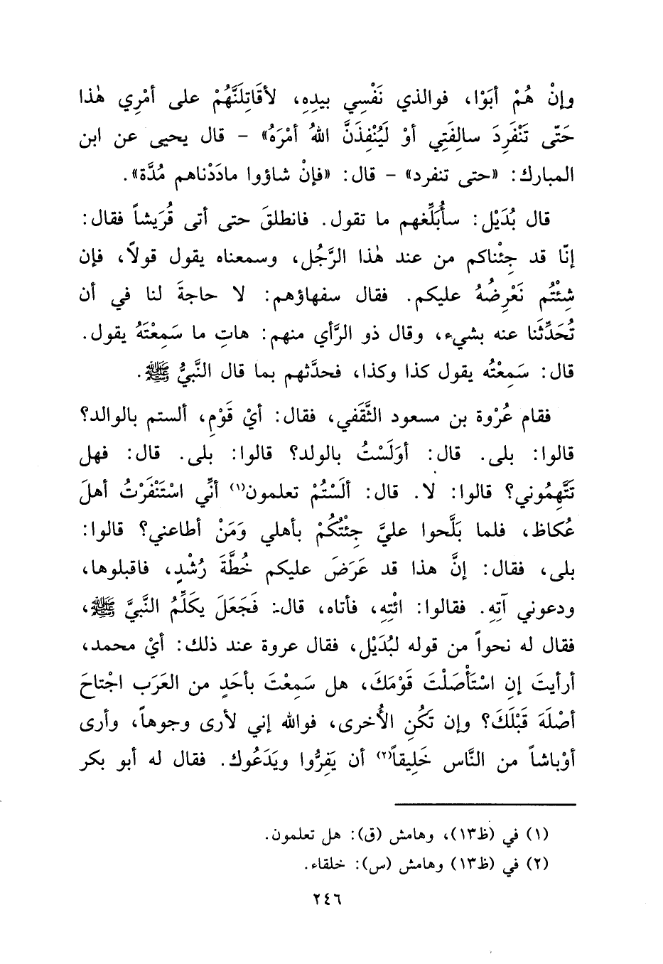 وَإِنْ هُمْ أَبَوْا، فَوَالَّذِي نَفْسِي بِيَدِهِ، لَأُقَاتِلَنَّهُمْ عَلَى أَمْرِي هَذَا حَتَّى تَنْفَرِدَ سَالِفَتِي أَوْ لَيُنْفِذَنَّ اللهُ أَمْرَهُ "، قَالَ يَحْيَى، عَنِ ابْنِ الْمُبَارَكِ: " حَتَّى تَنْفَرِدَ "، قَالَ: " فَإِنْ شَاءُوا مَادَدْنَاهُمْ مُدَّةً ". قَالَ بُدَيْلٌ: سَأُبَلِّغُهُمْ مَا تَقُولُ. فَانْطَلَقَ حَتَّى أَتَى قُرَيْشًا فَقَالَ: إِنَّا قَدْ جِئْنَاكُمْ مِنْ عِنْدِ هَذَا الرَّجُلِ، وَسَمِعْنَاهُ يَقُولُ قَوْلًا، فَإِنْ شِئْتُمْ نَعْرِضُهُ عَلَيْكُمْ. فَقَالَ سُفَهَاؤُهُمْ: لَا حَاجَةَ لَنَا فِي أَنْ تُحَدِّثَنَا عَنْهُ بِشَيْءٍ، وَقَالَ ذُو الرَّأْيِ مِنْهُمْ: هَاتِ مَا سَمِعْتَهُ يَقُولُ. قَالَ: قَدْ سَمِعْتُهُ يَقُولُ كَذَا وَكَذَا، فَحَدَّثَهُمْ بِمَا قَالَ النَّبِيُّ صَلَّى اللهُ عَلَيْهِ وَسَلَّمَ. فَقَامَ عُرْوَةُ بْنُ مَسْعُودٍ الثَّقَفِيُّ، فَقَالَ: أَيْ قَوْمُ، أَلَسْتُمْ بِالْوَالِدِ؟ قَالُوا: بَلَى. قَالَ: أَوَلَسْتُ بِالْوَلَدِ؟ قَالُوا: بَلَى. قَالَ: فَهَلْ تَتَّهِمُونِي؟ قَالُوا: لَا. قَالَ: أَلَسْتُمْ تَعْلَمُونَ (١) أَنِّي اسْتَنْفَرْتُ أَهْلَ عُكَاظٍ، فَلَمَّا بَلَّحُوا عَلَيَّ جِئْتُكُمْ بِأَهْلِي، وَمَنْ أَطَاعَنِي؟ قَالُوا: بَلَى، فَقَالَ: إِنَّ هَذَا قَدْ عَرَضَ عَلَيْكُمْ خُطَّةَ رُشْدٍ، فَاقْبَلُوهَا، وَدَعُونِي آتِهِ. فَقَالُوا: ائْتِهِ، فَأَتَاهُ، قَالَ: فَجَعَلَ يُكَلِّمُ النَّبِيَّ صَلَّى اللهُ عَلَيْهِ وَسَلَّمَ، فَقَالَ لَهُ نَحْوًا مِنْ قَوْلِهِ لِبُدَيْلٍ، فَقَالَ عُرْوَةُ عِنْدَ ذَلِكَ: أَيْ مُحَمَّدُ، أَرَأَيْتَ إِنْ اسْتَأْصَلْتَ قَوْمَكَ، هَلْ سَمِعْتَ بِأَحَدٍ مِنَ الْعَرَبِ اجْتَاحَ أَصْلَهُ قَبْلَكَ؟ وَإِنْ تَكُنِ الْأُخْرَى، فَوَاللهِ إِنِّي لَأَرَى وُجُوهًا، وَأَرَى أَوْبَاشًا مِنَ النَّاسِ خَلِيقًا (٢) أَنْ يَفِرُّوا وَيَدَعُوكَ. فَقَالَ لَهُ أَبُو بَكْرٍ