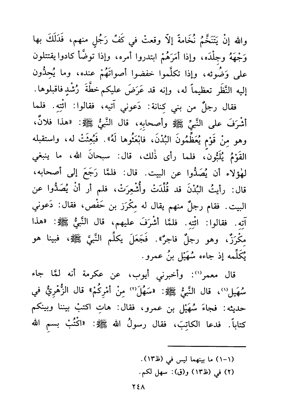 وَاللهِ إِنْ يَتَنَخَّمُ نُخَامَةً، إِلَّا وَقَعَتْ فِي كَفَّ رَجُلٍ مِنْهُمْ، فَدَلَكَ بِهَا وَجْهَهُ وَجِلْدَهُ، وَإِذَا أَمَرَهُمْ ابْتَدَرُوا أَمْرَهُ، وَإِذَا تَوَضَّأَ كَادُوا يَقْتَتِلُونَ عَلَى وَضُوئِهِ، وَإِذَا تَكَلَّمُوا خَفَضُوا أَصْوَاتَهُمْ عِنْدَهُ، وَمَا يُحِدُّونَ إِلَيْهِ النَّظَرَ تَعْظِيمًا لَهُ، وَإِنَّهُ قَدْ عَرَضَ عَلَيْكُمْ خُطَّةَ رُشْدٍ فَاقْبَلُوهَا. فَقَالَ رَجُلٌ مِنْ بَنِي كِنَانَةَ: دَعُونِي آتِيهِ، فَقَالُوا: ائْتِهِ. فَلَمَّا أَشْرَفَ عَلَى النَّبِيِّ صَلَّى اللهُ عَلَيْهِ وَسَلَّمَ وَأَصْحَابِهِ، قَالَ النَّبِيُّ صَلَّى اللهُ عَلَيْهِ وَسَلَّمَ: " هَذَا فُلَانٌ، وَهُوَ مِنْ قَوْمٍ يُعَظِّمُونَ الْبُدْنَ، فَابْعَثُوهَا لَهُ ". فَبُعِثَتْ لَهُ، وَاسْتَقْبَلَهُ الْقَوْمُ يُلَبُّونَ، فَلَمَّا رَأَى ذَلِكَ، قَالَ: " سُبْحَانَ اللهِ، مَا يَنْبَغِي لِهَؤُلَاءِ أَنْ يُصَدُّوا عَنِ الْبَيْتِ ". قَالَ: فَلَمَّا رَجَعَ إِلَى أَصْحَابِهِ، قَالَ: رَأَيْتُ الْبُدْنَ قَدْ قُلِّدَتْ وَأُشْعِرَتْ، فَلَمْ أَرَ أَنْ يُصَدُّوا عَنِ الْبَيْتِ. فَقَامَ رَجُلٌ مِنْهُمْ يُقَالُ لَهُ مِكْرَزُ بْنُ حَفْصٍ، فَقَالَ: دَعُونِي آتِهِ. فَقَالُوا: ائْتِهِ. فَلَمَّا أَشْرَفَ عَلَيْهِمْ، قَالَ النَّبِيُّ صَلَّى اللهُ عَلَيْهِ وَسَلَّمَ: " هَذَا مِكْرَزٌ، وَهُوَ رَجُلٌ فَاجِرٌ ". فَجَعَلَ يُكَلِّمُ النَّبِيَّ صَلَّى اللهُ عَلَيْهِ وَسَلَّمَ، فَبَيْنَا هُوَ يُكَلِّمُهُ، إِذْ جَاءَهُ سُهَيْلُ بْنُ عَمْرٍو. قَالَ مَعْمَرٌ (١) : وَأَخْبَرَنِي أَيُّوبُ، عَنْ عِكْرِمَةَ، أَنَّهُ لَمَّا جَاءَ سُهَيْلٌ، قَالَ النَّبِيُّ صَلَّى اللهُ عَلَيْهِ وَسَلَّمَ: " سَهُلَ (٢) مِنْ أَمْرِكُمْ " قَالَ الزُّهْرِيُّ فِي حَدِيثِهِ: فَجَاءَ سُهَيْلُ بْنُ عَمْرٍو، فَقَالَ: هَاتِ اكْتُبْ بَيْنَنَا وَبَيْنَكُمْ كِتَابًا. فَدَعَا الْكَاتِبَ، فَقَالَ رَسُولُ اللهِ صَلَّى اللهُ عَلَيْهِ وَسَلَّمَ: " اكْتُبْ بِسْمِ اللهِ