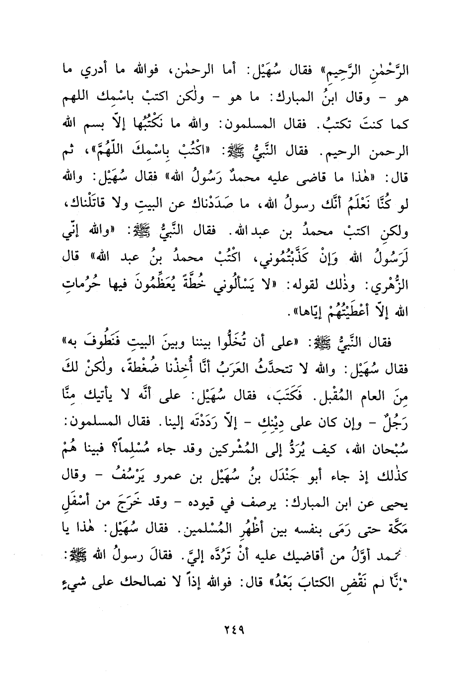 الرَّحْمَنِ الرَّحِيمِ " فَقَالَ سُهَيْلٌ: أَمَّا الرَّحْمَنُ، فَوَاللهِ مَا أَدْرِي مَا هُوَ، وَقَالَ ابْنُ الْمُبَارَكِ: مَا هُوَ، وَلَكِنْ اكْتُبْ بِاسْمِكَ اللهُمَّ كَمَا كُنْتَ تَكْتُبُ. فَقَالَ الْمُسْلِمُونَ: وَاللهِ مَا نَكْتُبُهَا إِلَّا بِسْمِ اللهِ الرَّحْمَنِ الرَّحِيمِ، فَقَالَ النَّبِيُّ صَلَّى اللهُ عَلَيْهِ وَسَلَّمَ: " اكْتُبْ بِاسْمِكَ اللهُمَّ "، ثُمَّ قَالَ: " هَذَا مَا قَاضَى عَلَيْهِ مُحَمَّدٌ رَسُولُ اللهِ " فَقَالَ سُهَيْلٌ: وَاللهِ لَوْ كُنَّا نَعْلَمُ أَنَّكَ رَسُولُ اللهِ، مَا صَدَدْنَاكَ عَنِ الْبَيْتِ وَلَا قَاتَلْنَاكَ، وَلَكِنْ اكْتُبْ مُحَمَّدُ بْنُ عَبْدِ اللهِ، فَقَالَ النَّبِيُّ صَلَّى اللهُ عَلَيْهِ وَسَلَّمَ: " وَاللهِ إِنِّي لَرَسُولُ اللهِ وَإِنْ كَذَّبْتُمُونِي، اكْتُبْ مُحَمَّدُ بْنُ عَبْدِ اللهِ " قَالَ الزُّهْرِيُّ: وَذَلِكَ لِقَوْلِهِ: " لَا يَسْأَلُونِي خُطَّةً يُعَظِّمُونَ فِيهَا حُرُمَاتِ اللهِ إِلَّا أَعْطَيْتُهُمْ إِيَّاهَا ". فَقَالَ النَّبِيُّ صَلَّى اللهُ عَلَيْهِ وَسَلَّمَ: " عَلَى أَنْ تُخَلُّوا بَيْنَنَا وَبَيْنَ الْبَيْتِ فَنَطُوفَ بِهِ " فَقَالَ سُهَيْلٌ: وَاللهِ لَا تَتَحَدَّثُ الْعَرَبُ أَنَّا أُخِذْنَا ضُغْطَةً، وَلَكِنْ لَكَ مِنَ الْعَامِ الْمُقْبِلِ. فَكَتَبَ، فَقَالَ سُهَيْلٌ: عَلَى أَنَّهُ لَا يَأْتِيكَ مِنَّا رَجُلٌ، وَإِنْ كَانَ عَلَى دِينِكَ، إِلَّا رَدَدْتَهُ إِلَيْنَا. فَقَالَ الْمُسْلِمُونَ: سُبْحَانَ اللهِ، كَيْفَ يُرَدُّ إِلَى الْمُشْرِكِينَ وَقَدْ جَاءَ مُسْلِمًا؟ فَبَيْنَا هُمْ كَذَلِكَ، إِذْ جَاءَ أَبُو جَنْدَلِ بْنُ سُهَيْلِ بْنِ عَمْرٍو يَرْسُفُ، وَقَالَ يَحْيَى عَنِ ابْنِ الْمُبَارَكِ: يَرْصُفُ فِي قُيُودِهِ، وَقَدْ خَرَجَ مِنْ أَسْفَلِ مَكَّةَ حَتَّى رَمَى بِنَفْسِهِ بَيْنَ أَظْهُرِ الْمُسْلِمِينَ. فَقَالَ سُهَيْلٌ: هَذَا يَا مُحَمَّدُ، أَوَّلُ مَا أُقَاضِيكَ عَلَيْهِ أَنْ تَرُدَّهُ إِلَيَّ. فَقَالَ رَسُولُ اللهِ صَلَّى اللهُ عَلَيْهِ وَسَلَّمَ: " إِنَّا لَمْ نَقْضِ الْكِتَابَ بَعْدُ " قَالَ: فَوَاللهِ إِذًا لَا نُصَالِحُكَ عَلَى شَيْءٍ