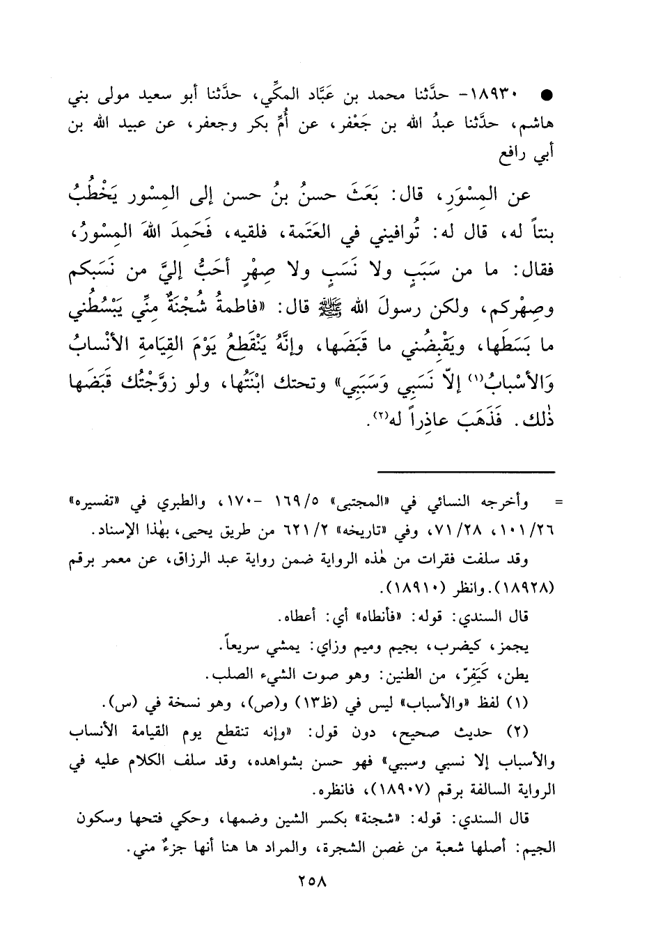 ١٨٩٣٠ - حَدَّثَنَا مُحَمَّدُ بْنُ عَبَّادٍ الْمَكِّيُّ، حَدَّثَنَا أَبُو سَعِيدٍ، مَوْلَى بَنِي هَاشِمٍ، حَدَّثَنَا عَبْدُ اللهِ بْنُ جَعْفَرٍ، عَنْ أُمِّ بَكْرٍ، وَجَعْفَرٍ، عَنْ عُبَيْدِ اللهِ بْنِ أَبِي رَافِعٍ، عَنِ الْمِسْوَرِ قَالَ: بَعَثَ حَسَنُ بْنُ حَسَنٍ إِلَى الْمِسْوَرِ يَخْطُبُ بِنْتًا لَهُ قَالَ لَهُ: تُوَافِينِي فِي الْعَتَمَةِ، فَلَقِيَهُ، فَحَمِدَ اللهَ الْمِسْوَرُ، فَقَالَ: مَا مِنْ سَبَبٍ، وَلَا نَسَبٍ، وَلَا صِهْرٍ، أَحَبُّ إِلَيَّ مِنْ نَسَبِكُمْ، وَصِهْرِكُمْ، وَلَكِنَّ رَسُولَ اللهِ صَلَّى اللهُ عَلَيْهِ وَسَلَّمَ قَالَ: " فَاطِمَةُ شُجْنَةٌ مِنِّي، يَبْسُطُنِي مَا بَسَطَهَا، وَيَقْبِضُنِي مَا قَبَضَهَا، وَإِنَّهُ يَنْقَطِعُ يَوْمَ الْقِيَامَةِ الْأَنْسَابُ وَالْأَسْبَابُ (١) ، إِلَّا نَسَبِي وَسَبَبِي "، وَتَحْتَكَ ابْنَتُهَا، وَلَوْ زَوَّجْتُكَ قَبَضَهَا ذَلِكَ. فَذَهَبَ عَاذِرًا لَهُ (٢)
