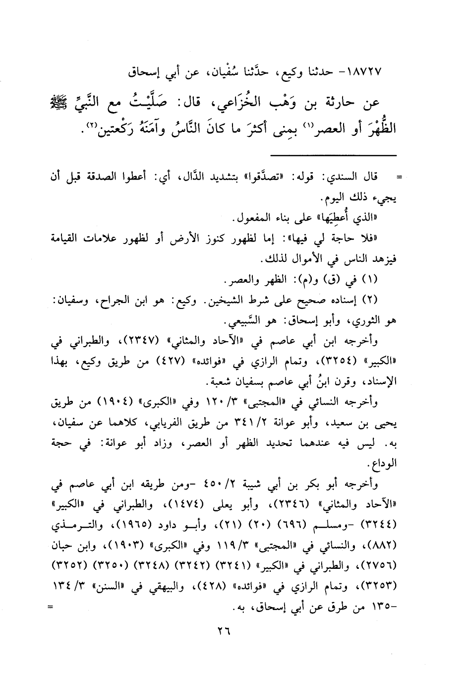 ١٨٧٢٧ - حَدَّثَنَا وَكِيعٌ، حَدَّثَنَا سُفْيَانُ، عَنْ أَبِي إِسْحَاقَ، عَنْ حَارِثَةَ بْنِ وَهْبٍ الْخُزَاعِيِّ قَالَ: " صَلَّيْتُ مَعَ النَّبِيِّ صَلَّى اللهُ عَلَيْهِ وَسَلَّمَ الظُّهْرَ أَوِ الْعَصْرَ (١) بِمِنًى، أَكْثَرَ مَا كَانَ النَّاسُ، وَآمَنَهُ رَكْعَتَيْنِ " (٢)