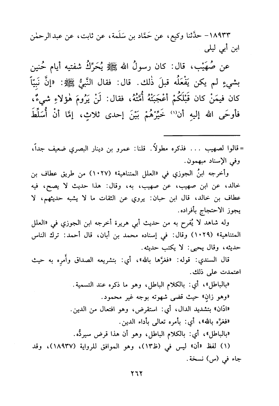 ١٨٩٣٣ - حَدَّثَنَا وَكِيعٌ، عَنْ حَمَّادِ بْنِ سَلَمَةَ، عَنْ ثَابِتٍ، عَنْ عَبْدِ الرَّحْمَنِ بْنِ أَبِي لَيْلَى، عَنْ صُهَيْبٍ، قَالَ: كَانَ رَسُولُ اللهِ صَلَّى اللهُ عَلَيْهِ وَسَلَّمَ يُحَرِّكُ شَفَتَيْهِ أَيَّامَ حُنَيْنٍ بِشَيْءٍ لَمْ يَكُنْ يَفْعَلُهُ قَبْلَ ذَلِكَ، قَالَ: فَقَالَ النَّبِيُّ صَلَّى اللهُ عَلَيْهِ وَسَلَّمَ: " إِنَّ نَبِيًّا كَانَ فِيمَنْ كَانَ قَبْلَكُمْ أَعْجَبَتْهُ أُمَّتُهُ، فَقَالَ: لَنْ يَرُومَ هَؤُلَاءِ شَيْءٌ، فَأَوْحَى اللهُ إِلَيْهِ: أَنْ (١) خَيِّرْهُمْ بَيْنَ إِحْدَى ثَلَاثٍ: إِمَّا أَنْ أُسَلِّطَ