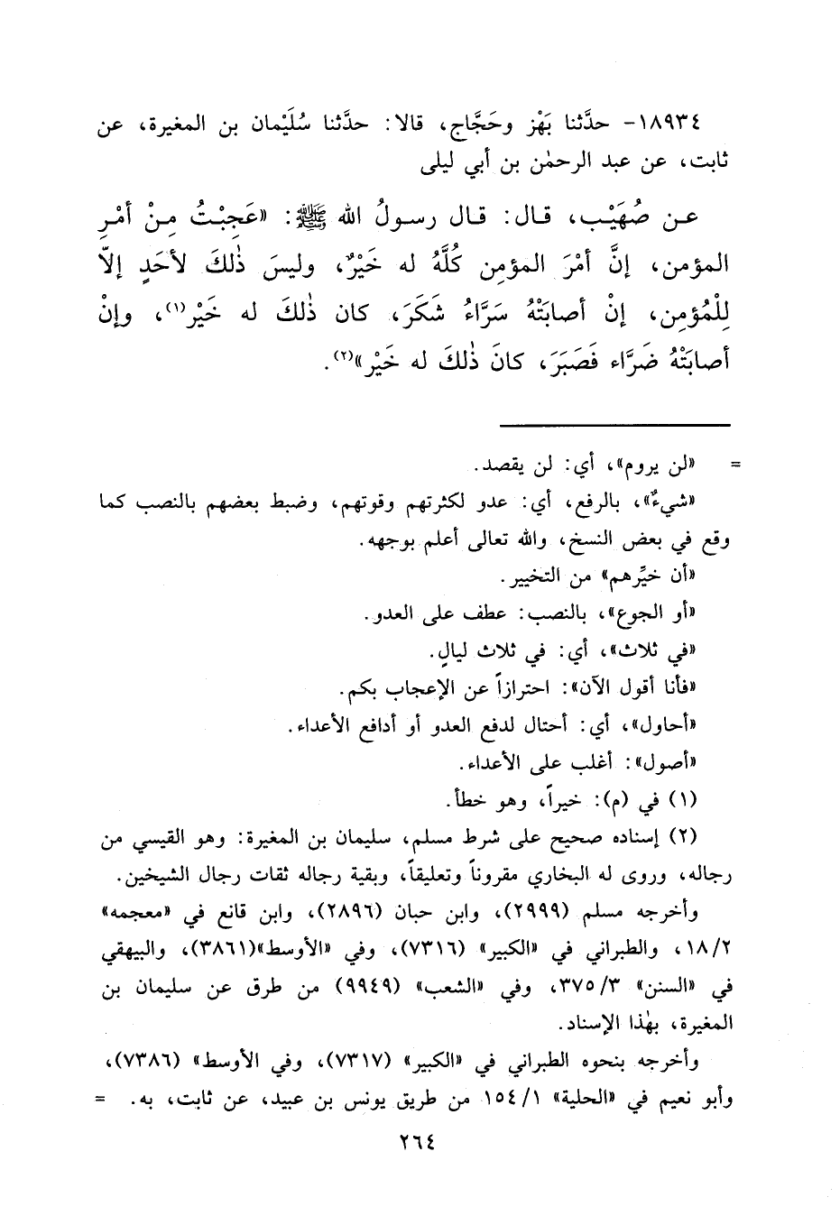١٨٩٣٤ - حَدَّثَنَا بَهْزٌ، وَحَجَّاجٌ، قَالَا: حَدَّثَنَا سُلَيْمَانُ بْنُ الْمُغِيرَةِ، عَنْ ثَابِتٍ، عَنْ عَبْدِ الرَّحْمَنِ بْنِ أَبِي لَيْلَى، عَنْ صُهَيْبٍ قَالَ: قَالَ رَسُولُ اللهِ صَلَّى اللهُ عَلَيْهِ وَسَلَّمَ: " عَجِبْتُ مِنْ أَمْرِ الْمُؤْمِنِ، إِنَّ أَمْرَ الْمُؤْمِنِ كُلَّهُ لَهُ خَيْرٌ، وَلَيْسَ ذَلِكَ لِأَحَدٍ إِلَّا لِلْمُؤْمِنِ، إِنْ أَصَابَتْهُ سَرَّاءُ شَكَرَ، كَانَ ذَلِكَ لَهُ خَيْرًا، (١) وَإِنْ أَصَابَتْهُ ضَرَّاءُ فَصَبَرَ، كَانَ ذَلِكَ لَهُ خَيْرًا " (٢)