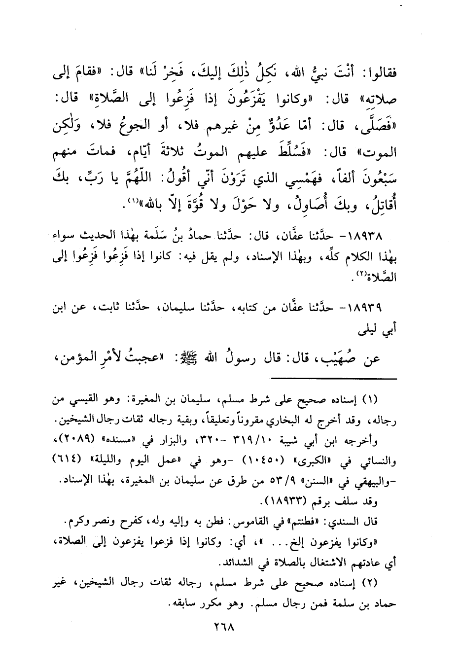 ١٨٩٣٨ - حَدَّثَنَا عَفَّانُ، قَالَ: حَدَّثَنَا حَمَّادُ بْنُ سَلَمَةَ بِهَذَا الْحَدِيثِ سَوَاءً بِهَذَا الْكَلَامِ كُلِّهِ، وَبِهَذَا الْإِسْنَادِ، وَلَمْ يَقُلْ فِيهِ: كَانُوا إِذَا فَزِعُوا فَزِعُوا إِلَى الصَّلَاةِ (٢)